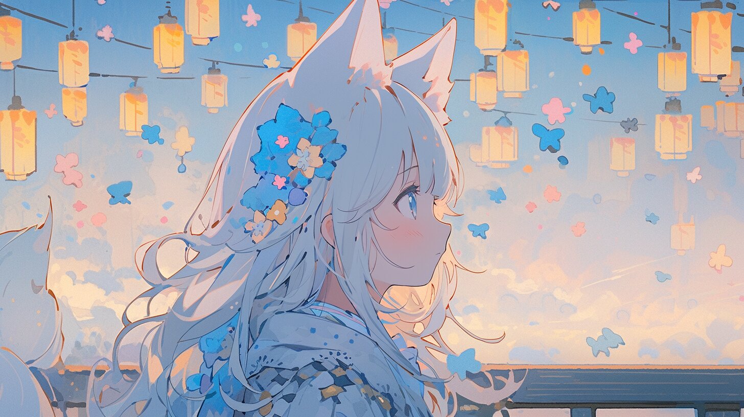 夏祭りの宵に、狐耳の少女が屋根の上に佇む。白銀の髪に青い花を飾り、伝統の衣を纏った彼女は、浮かぶ灯籠と蝶の群れを優しく見つめる。夕暮れの空に願いを込めて、少女の心は遠い記憶を辿る。かつての仲間との約束が、柔らかな光に溶けていく。この幻想的な瞬間は、永遠の冒険の始まりを予感させる。あなたも彼女の物語に寄り添ってみては?
