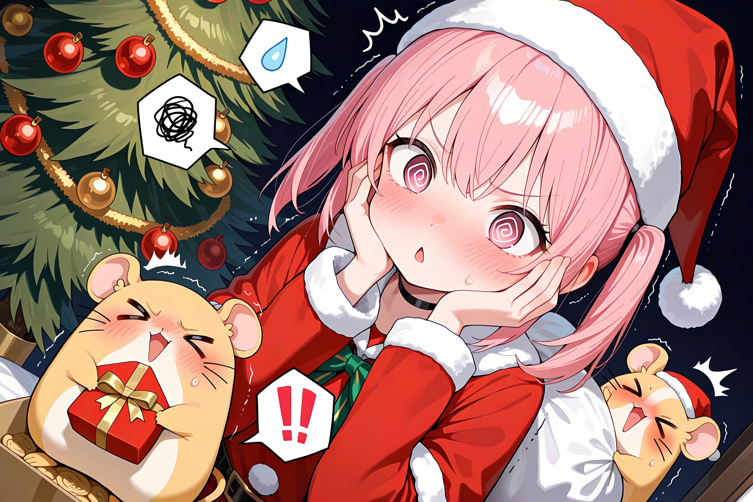1 little girl, solo, diagonal angle, masterpiece, best quality, amazing quality, very aesthetic, pink hair, twintails, pink eyes, @_@, chestnut mouth, angry, troubled, confused, tearful, blush, trembling, sweat, flying sweatdrop, spoken sweatdrop, spoken squiggle, ^^^, spoken , hands on own face, hamsters on her shoulders, > <, choker, santa costume, santa hat, christmas tree, empty box, open box,