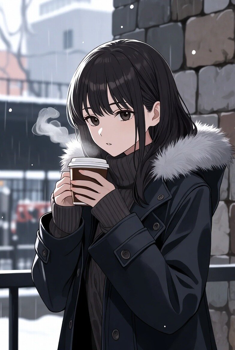 A young Japanese woman drinks coffee in a cold urban setting, with falling snow or rain.