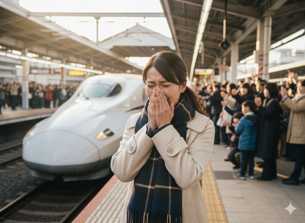 A Japanese woman in her late twenties to early thirties wipes away tears with both hands as she watches the Shinkansen 0 Series depart. The scene is set on a station platform in daylight. Her skin is a bright medium tone, her dark brown hair pulled back into a low ponytail with loose strands framing her face. She wears a cream-colored wide-collared coat and a navy blue checkered scarf accented with brown and white. Her eyes are closed, her brows furrowed, tears streaming down her cheeks in an emotional expression. In the background, the iconic white and blue Shinkansen 0 Series, characterized by its rounded front end and large circular headlights, prepares for departure. A large crowd of people of various ages and genders gathers on the platform, waving and taking photos as they see the 0 Series Shinkansen off. The platform is covered by a metal roof supported by steel beams, with the ground paved in concrete and light gray tiles, featuring yellow tactile paving blocks. A warm, nostalgic, and affectionate atmosphere pervades the scene. The composition focuses on the woman and the 0 Series Shinkansen in the foreground, with the background and crowd slightly blurred.