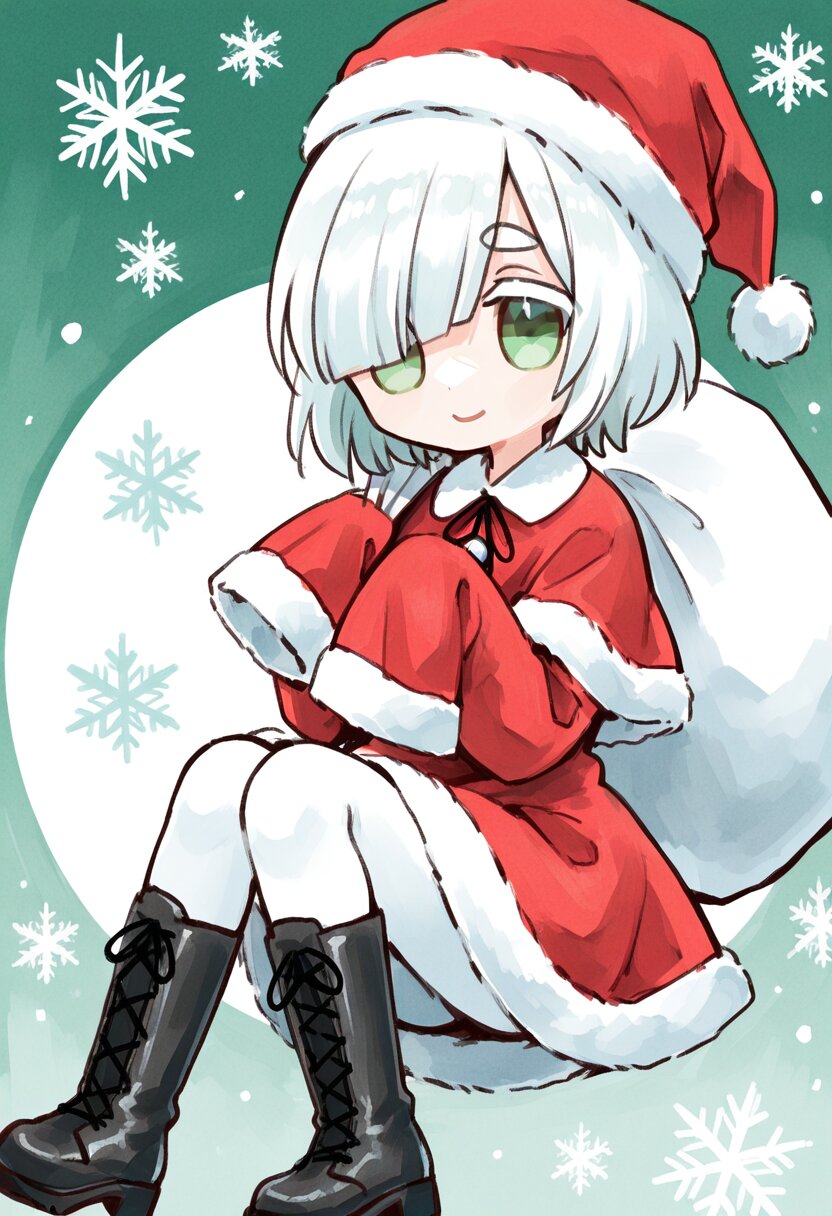 <lora:inmnstyleilxl:0.9>, best quality, masterpiece, very aesthetic, watercolor painting, general, 1girl, chibi, solo, (bright white hair), short hair, blunt bangs, white thick eyebrow, white colored eyelashes, (hair over one eye), mint green eyes, smile, red santa's hat, fur trimmed red capelet, fur trimmed red dress, long sleeves, sleeves past wrists, sleeves past fingers, white tights, black lace-up boots, carry santa's bag, snowflakes