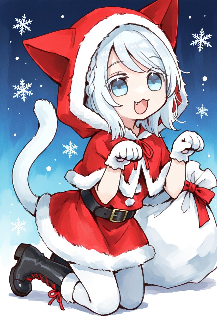 <lora:inmnstyleilxl:0.9>, best quality, masterpiece, very aesthetic, watercolor painting, general, 1girl, chibi, solo, white hair, medium hair, braid bangs, swept bangs, pale blue eyes, white colored eyelashes, :3, fang, smile, open mouth, cat tail, fur trimmed red capelet, red hood with cat ears, hood up, hair covered hood, fur trimmed red jacket, thick black belt around waist, fur trimmed red flare skirt, white tights, red ribbon lace-up tights, black lace-up boots, kneeling, paw pose, white santa's bag on floor, snowflakes