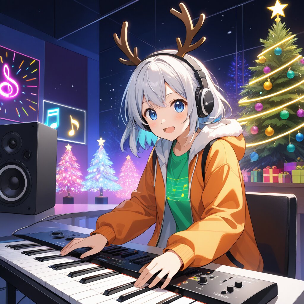 girl. Playing electronic music keyboard, beat sounds, music note visualization, black and white speaker, Christmas neon lights, Christmas tree, runaway reindeer girl, Yay! pose, colors (familiar face) (anime style)