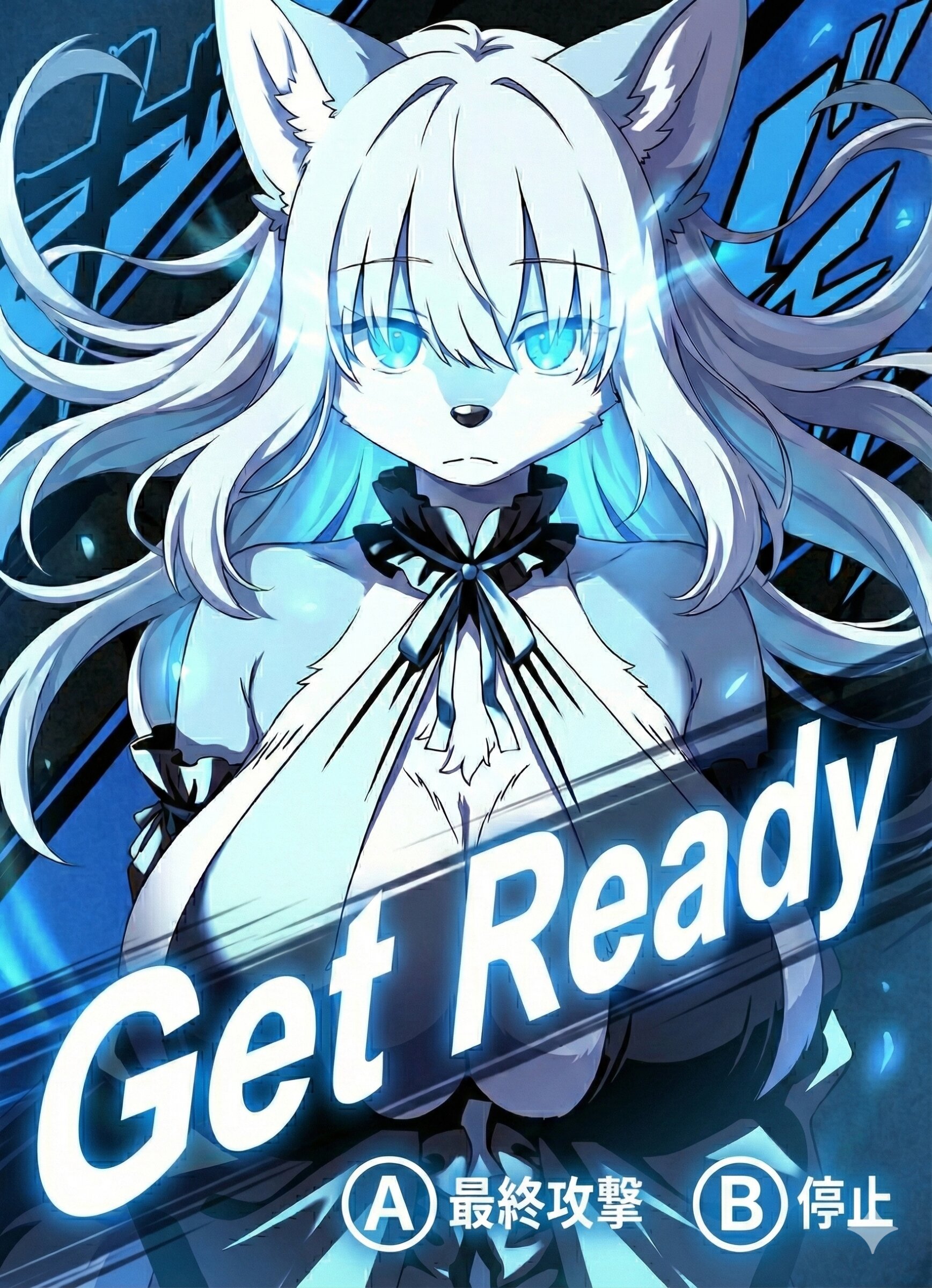 イラストのキャラクターをGペンでペン入れする。カラー、影とコントラスト。線は細く薄くする。フラット。前面に光が当たる。 ▶︎ 髪を風で浮き上がらせて漂わせ、水色の瞳を光らせる。 ▶︎ 斜めに遠近感の有るイタリック体の白文字で「Get Ready」と表示。 ▶︎ 「Get Ready」の下に、「A 最終攻撃」「B 停止」と表示。AとBは◯で囲む。 ▶︎ 「最終攻撃」と「停止」を明朝体に変更。