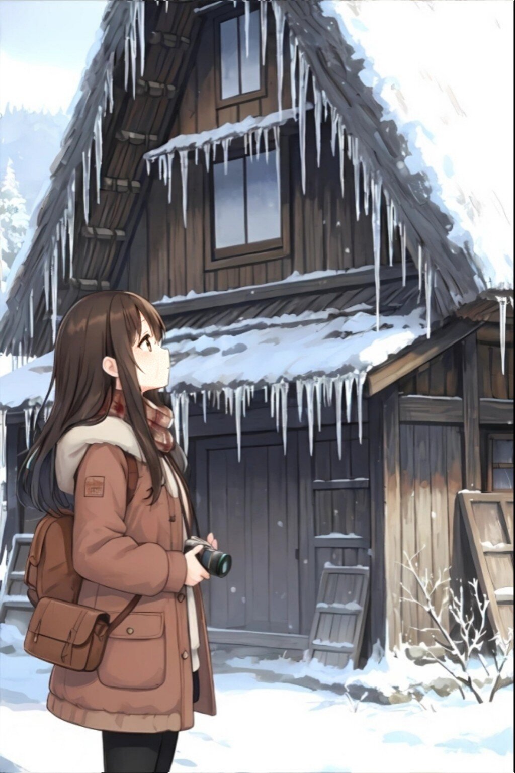 Anime-style illustration of a cute girl enjoying a winter day. She has long brown hair, rosy cheeks, and is dressed in warm winter clothing, including a thick brown parka and a checkered scarf. She holds a compact camera. In the background, a heavily snow-laden traditional Japanese minka-style house with prominent icicles and wooden textures. The foreground has fresh snow with small dried plants poking through. Soft color palette, serene expression. This is an atmospheric piece. Anime-style, high resolution, ultra-fine fabric, exquisite embroidery, realistic folds.