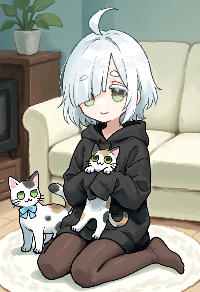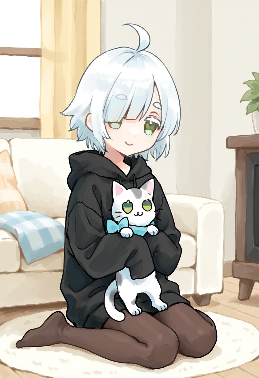 <lora:inmnstyleilxl:0.9>, best quality, masterpiece, very aesthetic, watercolor painting, general, 1girl, chibi, solo, cat, cat with ribbon, (bright white hair), short hair, blunt bangs, white thick eyebrow, white colored eyelashes, (hair over one eye), ahoge, mintgreen eyes, oversize black hoodie, sleeves past wrists, brown tights, smile, wariza, living room
