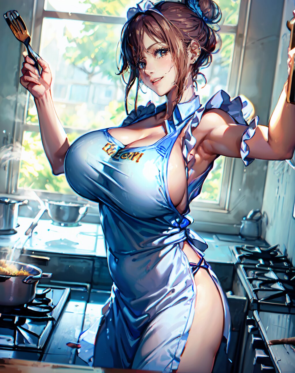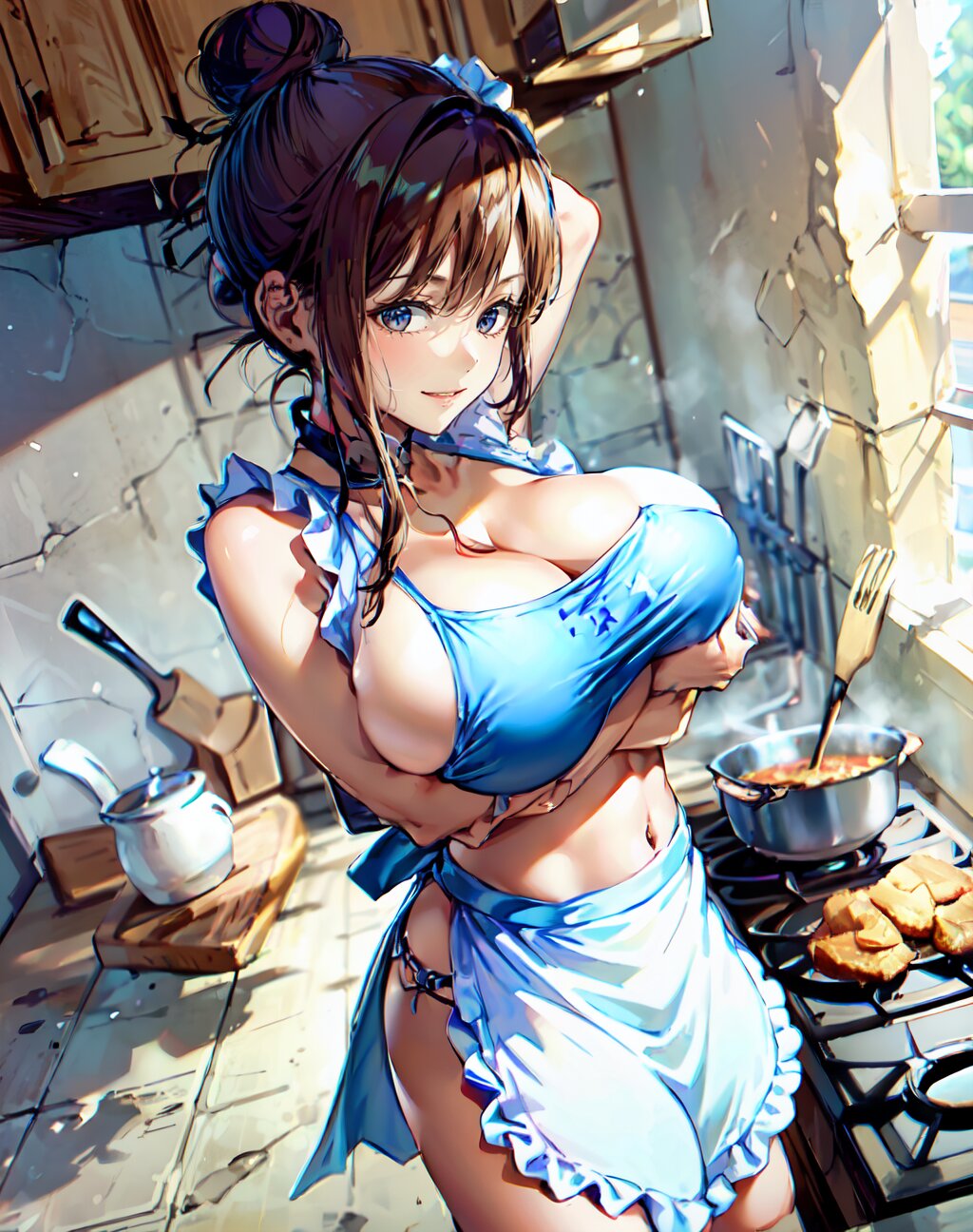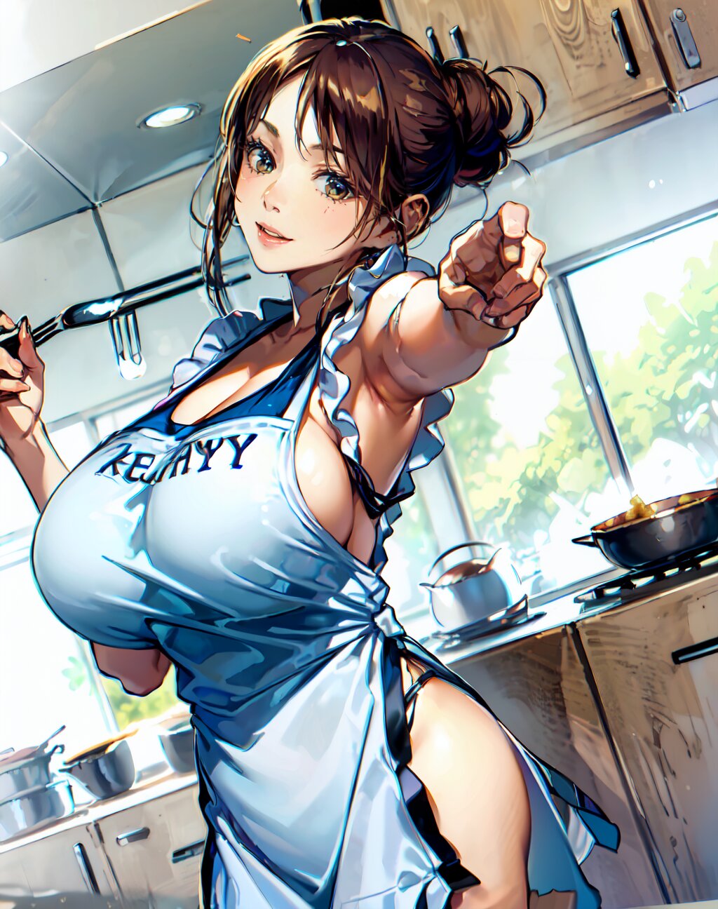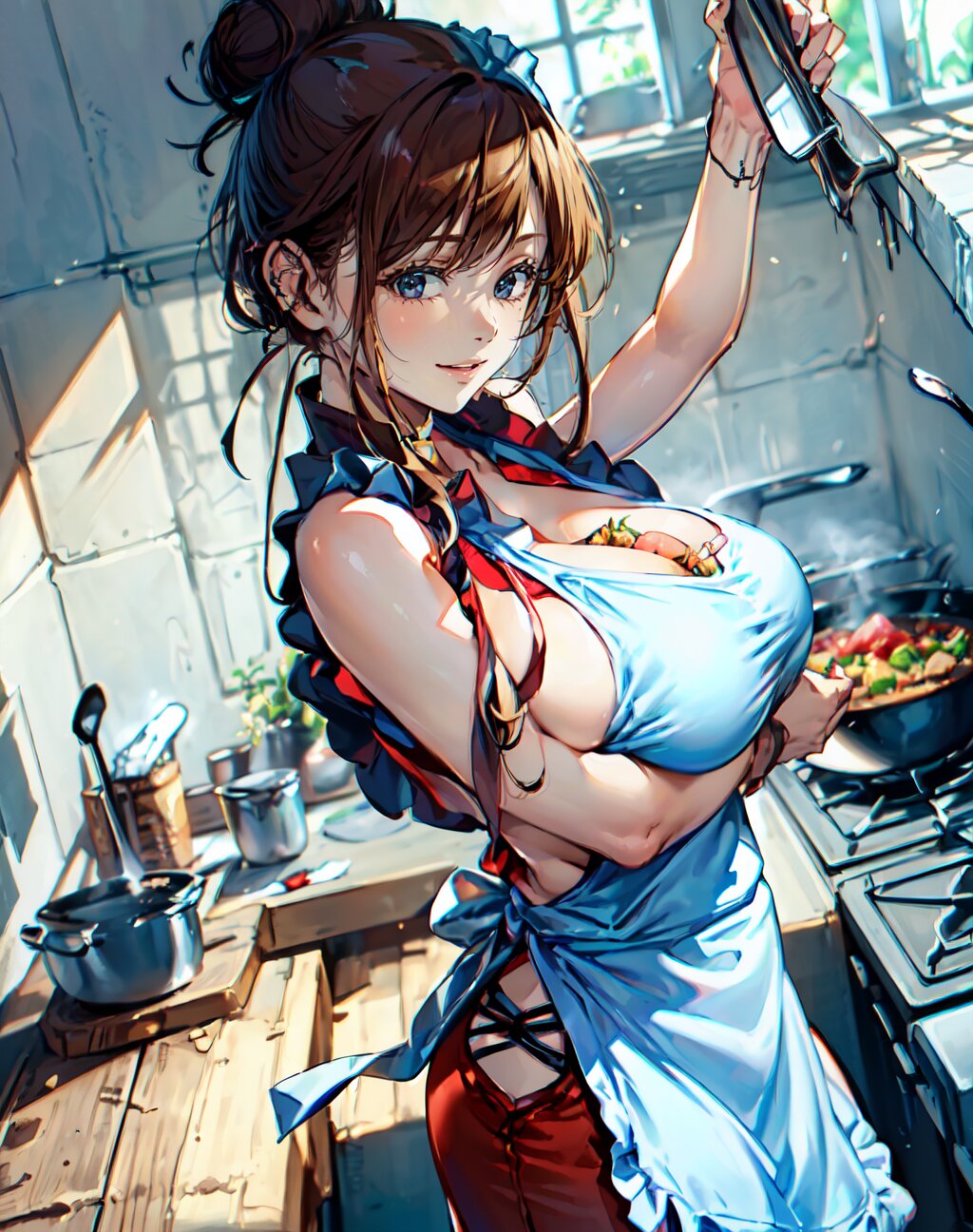 (random pose, random angle: 1.6), 1girl, solo, (cook, apron, sleeveless shirt: 1.4), (hair bun: 1.6), navel, lips, parted lips, (huge breast: 1.6), bound, belt, piercing, realistic, (cowboy shot: 1.8), (cooking in the kitchen: 1.6), <lora:anri_v01:0.8>