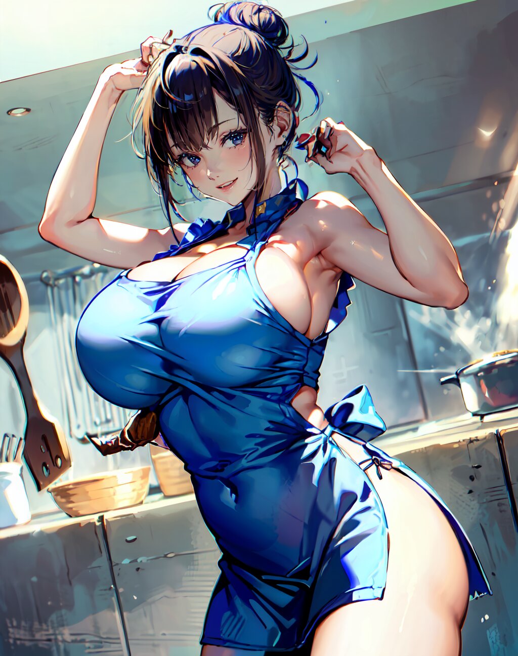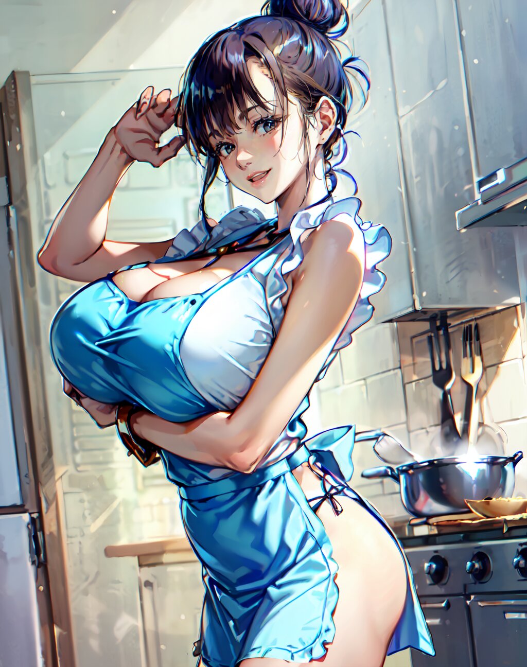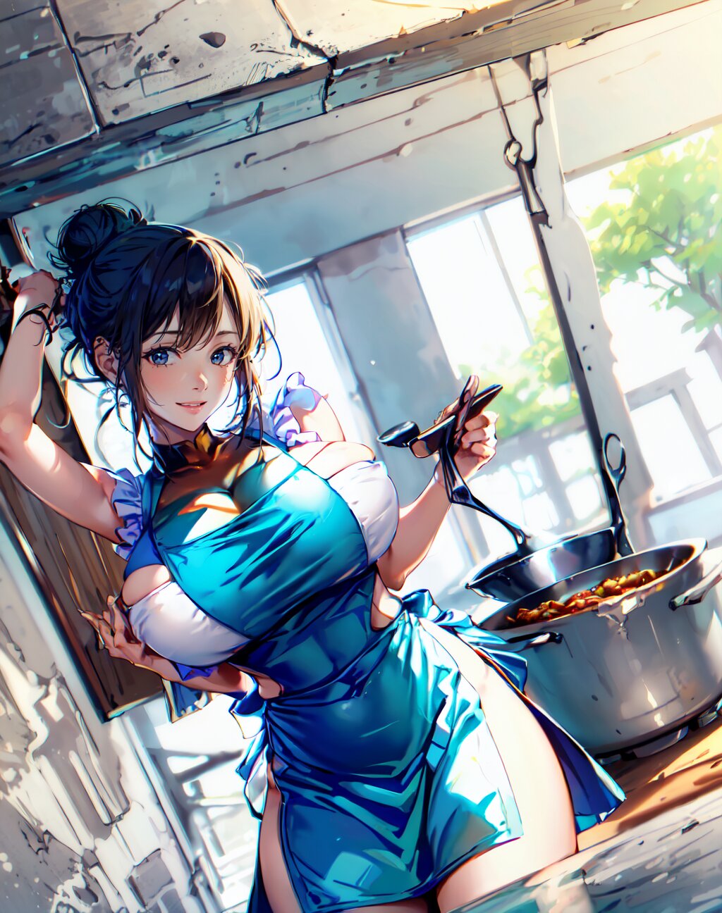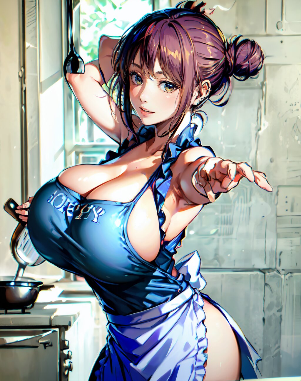 (random pose, random angle: 1.6), 1girl, solo, (cook, apron, sleeveless shirt: 1.4), (hair bun: 1.6), navel, lips, parted lips, (huge breast: 1.6), bound, belt, piercing, realistic, (cowboy shot: 1.8), (cooking in the kitchen: 1.6), <lora:anri_v01:0.8>