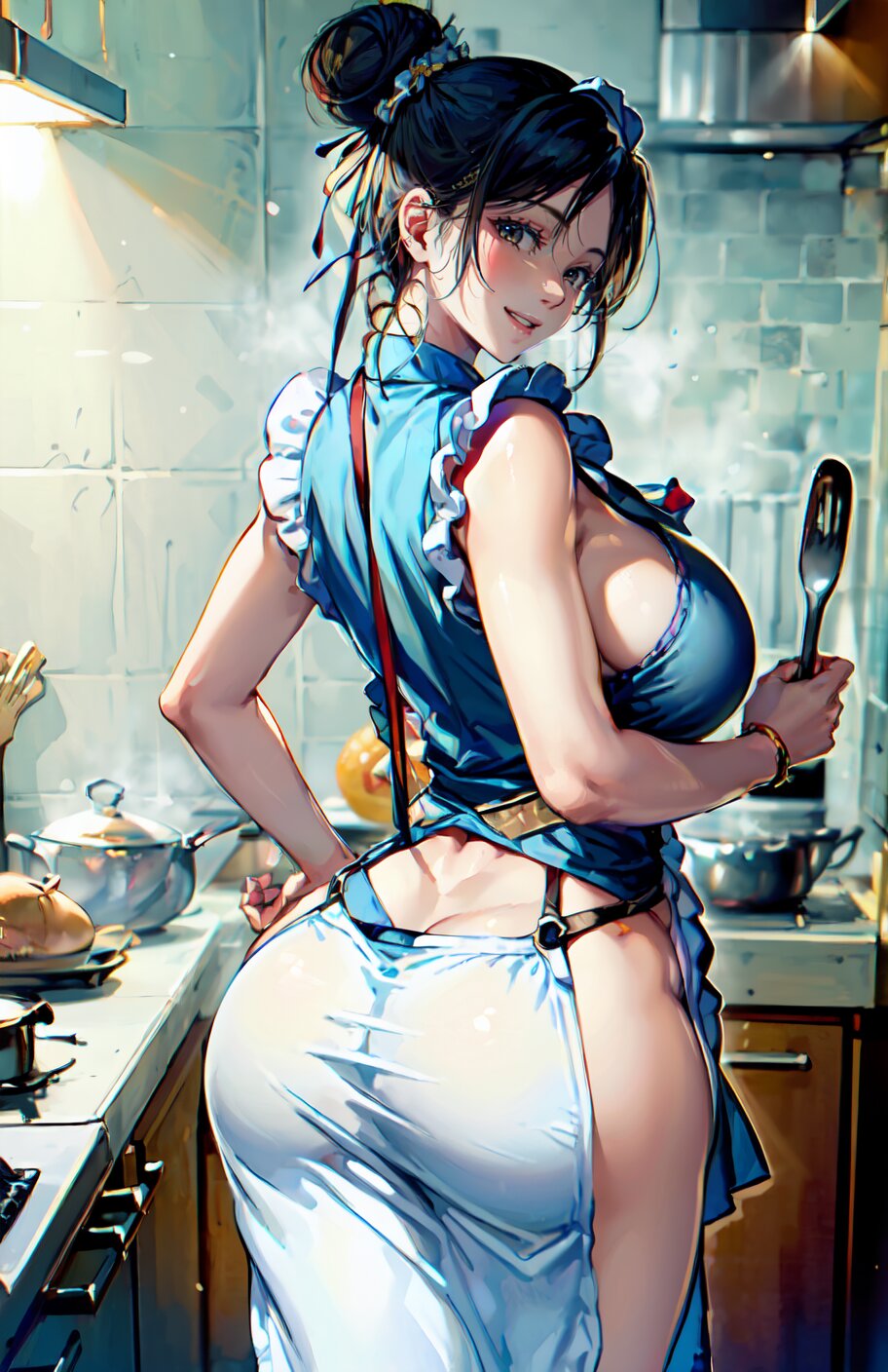 (sexy posing, from back: 1.6), 1girl, solo, (cook, apron, sleeveless shirt: 1.4), (hair bun: 1.6), navel, lips, parted lips, (huge breast, big ass: 1.6), bound, belt, piercing, realistic, looking back, (cowboy shot: 1.4), (cooking in the kitchen: 1.2), <lora:anri_v01:0.8>