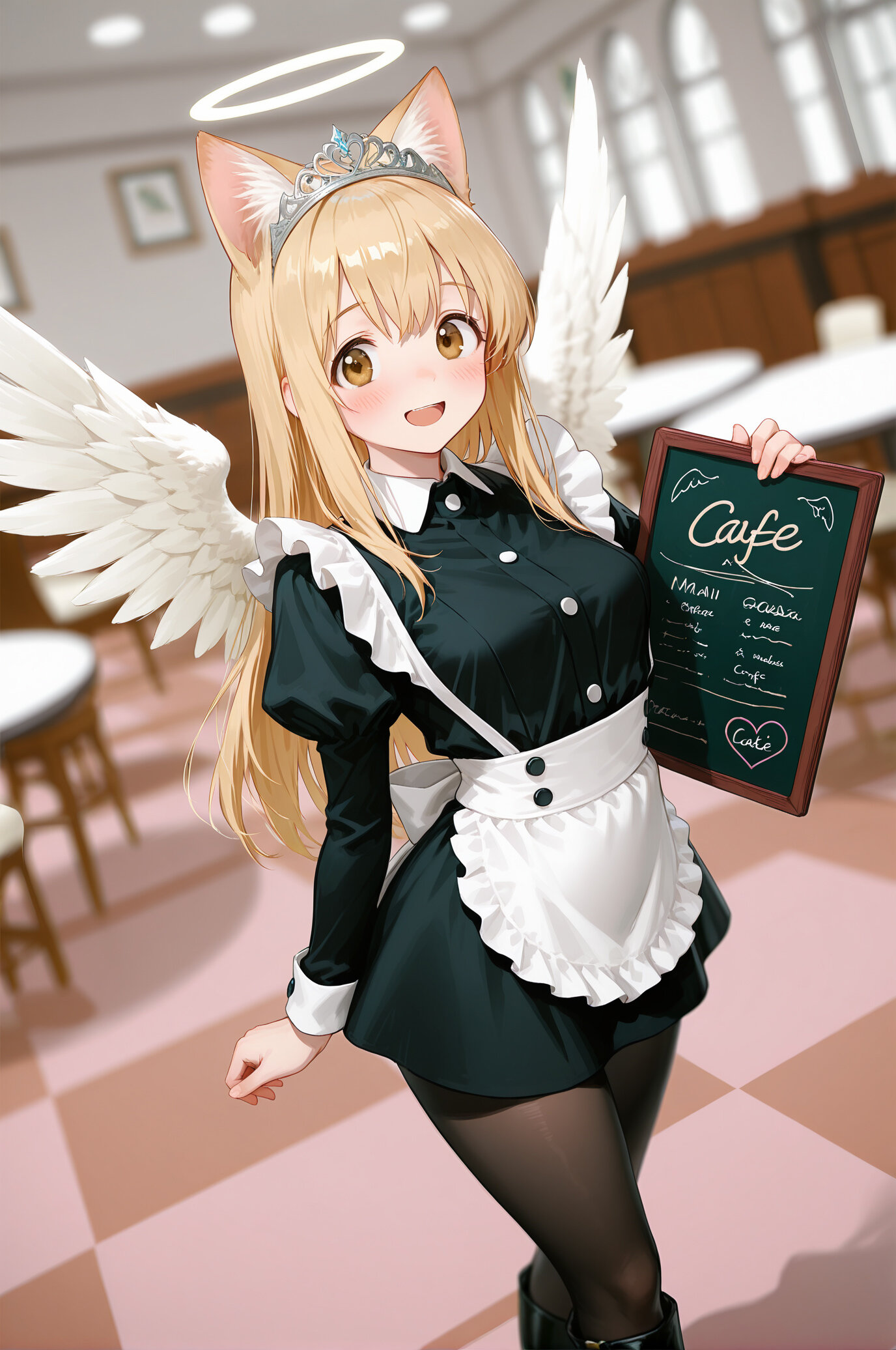 masterpiece, best quality, absurdres, 8k, ultra detailed, aesthetic, very aesthetic, newest, <lora:Fixhands_anime_bdsqlsz_V1:0.5>, <lora:bold-16oa:-0.5>, (realistic:0.3),BREAK (shallow depth of field,Gaussian Blur:1.6),blush,a girl wearing maid costume, gentle smile, cat ears, soft natural lighting, peaceful atmosphere, high-detail illustration,black pantyhose,boots,a modern maid cafe, pink and pastel interior, cute cafe decorations, menu boards, heart-shaped signs, checkered cafe floor, small round tables,(happy:1.3),(smile,tareme:1.3),blonde hair, long hair, brown eyes, (white angel wings:1.2),tiara,(standing:1.3),,open mouth,(cowboy shot,wide angle,wide shot:1.3),(medium breasts,curvy:1.3),<lora:USNR STYLE_XL_loha:0.8>