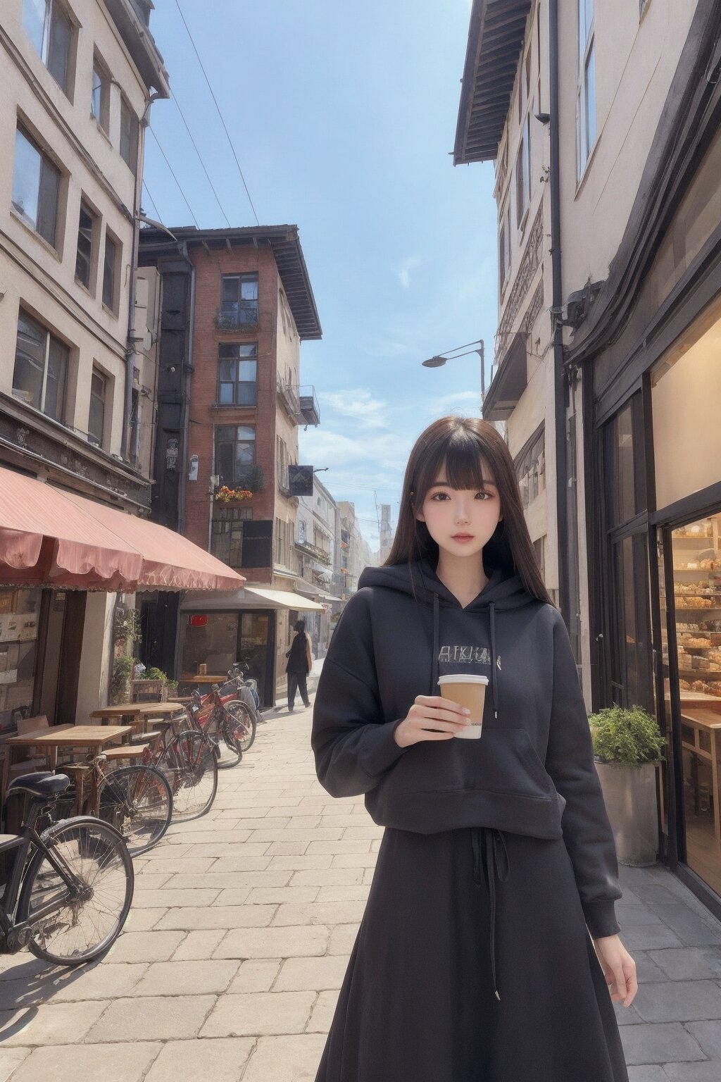 masterpiece, hyper detailed, 16K, RAW photo, realistic, Japanese woman, 23yo, cute, pretty, slit eyes, round face, hyper detailed face, hyper detailed eye, beautiful eye, extremely detailed, medium hair,bangs, thin body, tall body, perfect anatomy, perfect proportions, extremely detailed body, hoodie,long skirt, walking, winter, day light, sun, city background, building, shop,cafe, hyper detailed background,