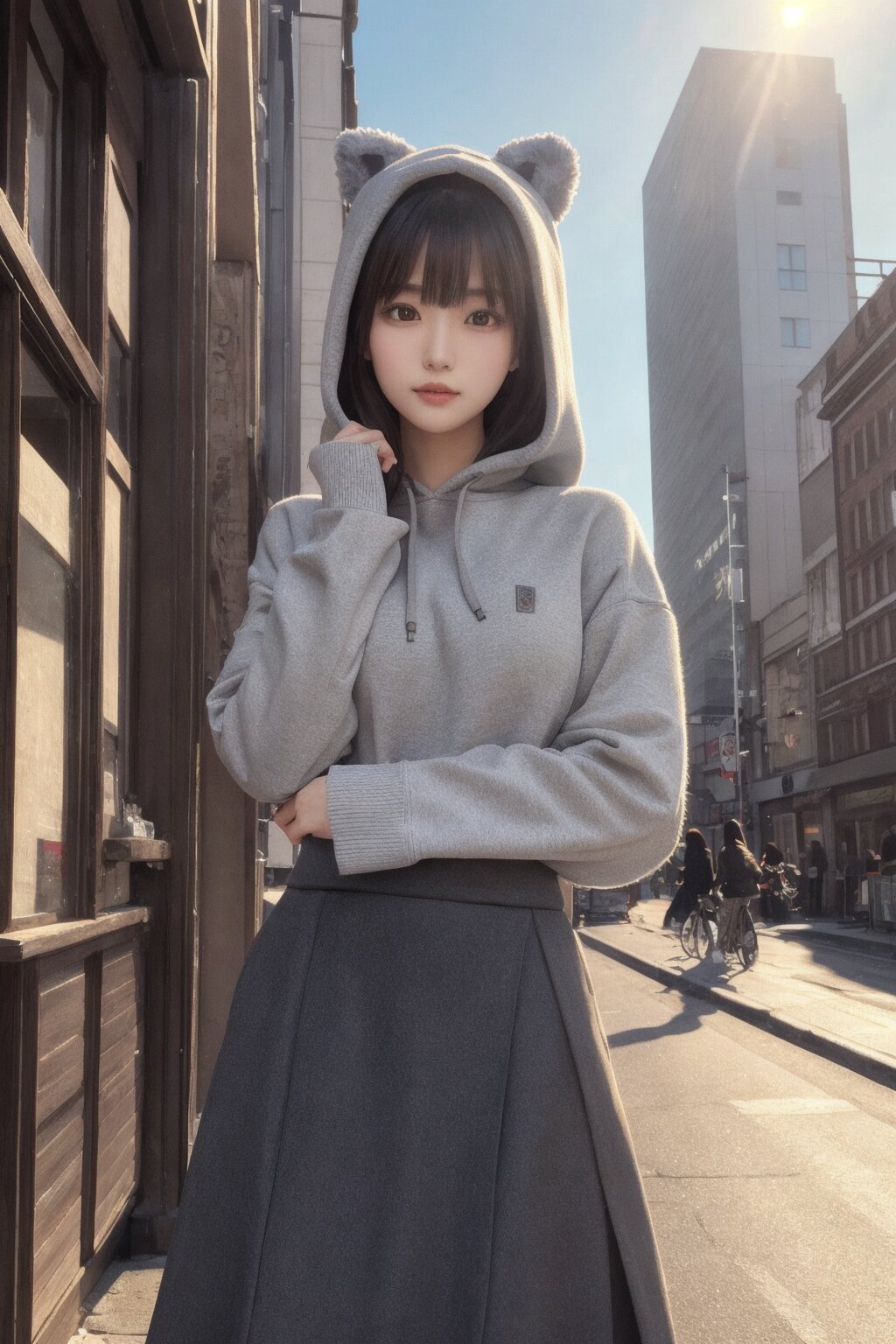 masterpiece, hyper detailed, 16K, RAW photo, realistic, Japanese woman, 23yo, cute, pretty, slit eyes, round face, hyper detailed face, hyper detailed eye, beautiful eye, extremely detailed, medium hair,bangs, thin body, tall body, perfect anatomy, perfect proportions, extremely detailed body, looking at viewer, waving hands, hoodie,long skirt, winter, day light, sun, city background, building, shop,cafe, hyper detailed background,