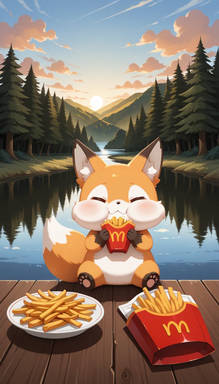 chibi, 1 furry, solo ,fox, (no human:1.6),french fries, food, puffy-cheeks, puffy cheeks, eating, no lineart,no outline, forest, fields, clouds, lake,