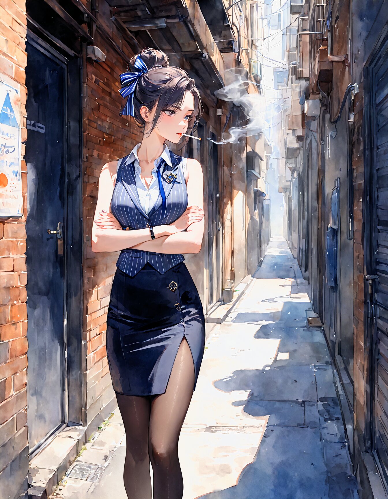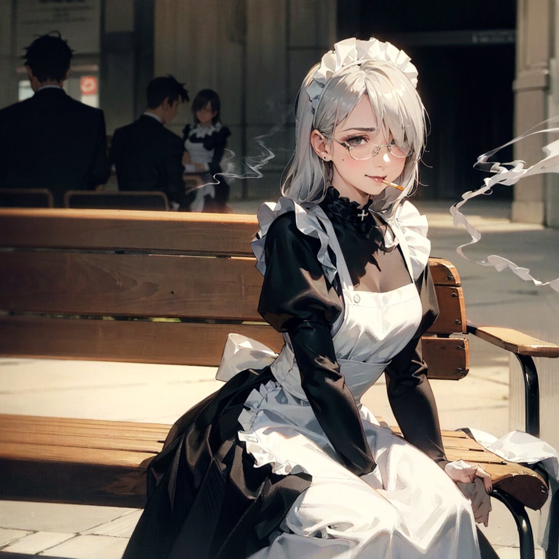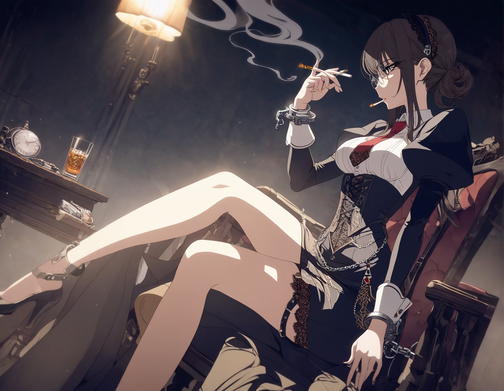 1girl, high res, detailed illustration, perfect anatomy, secretary, profile, wood chair, sitting wood, detailed shiny hair, juliet sleeves, corset, necktie, long skirt, metal square under rimb glasses, embroidery clothes, gorgeous botanical lace clothes, smoking cigarette, cigarette holder, smoke, dark room, coustics, cinematic lighting, cinematic shadows, cinematic angle, cinematic pose, misc cnv3mdde878c738thn20 detailed eyes, detailed legs legs, thighs Perfect hand, cuff links, glasses, Detailed handcuffs, hand on own thigh, glass, round eyewear, smoking, solo, long legs, puffy sleeves, shackles, skirt, masterpiece, best quality <lora:add-detail-xl:0.66> <lora:Detailed anime style - SDXL_pony:0.83> <lora:DetailedEyes_V3:0.67> <lora:StS_PonyXL_Detail_Slider_v1.4_iteration_3:1.07> <lora:legs_detailed_2.0:0.65> <lora:Better hands - SDXL v2.0:0.68>