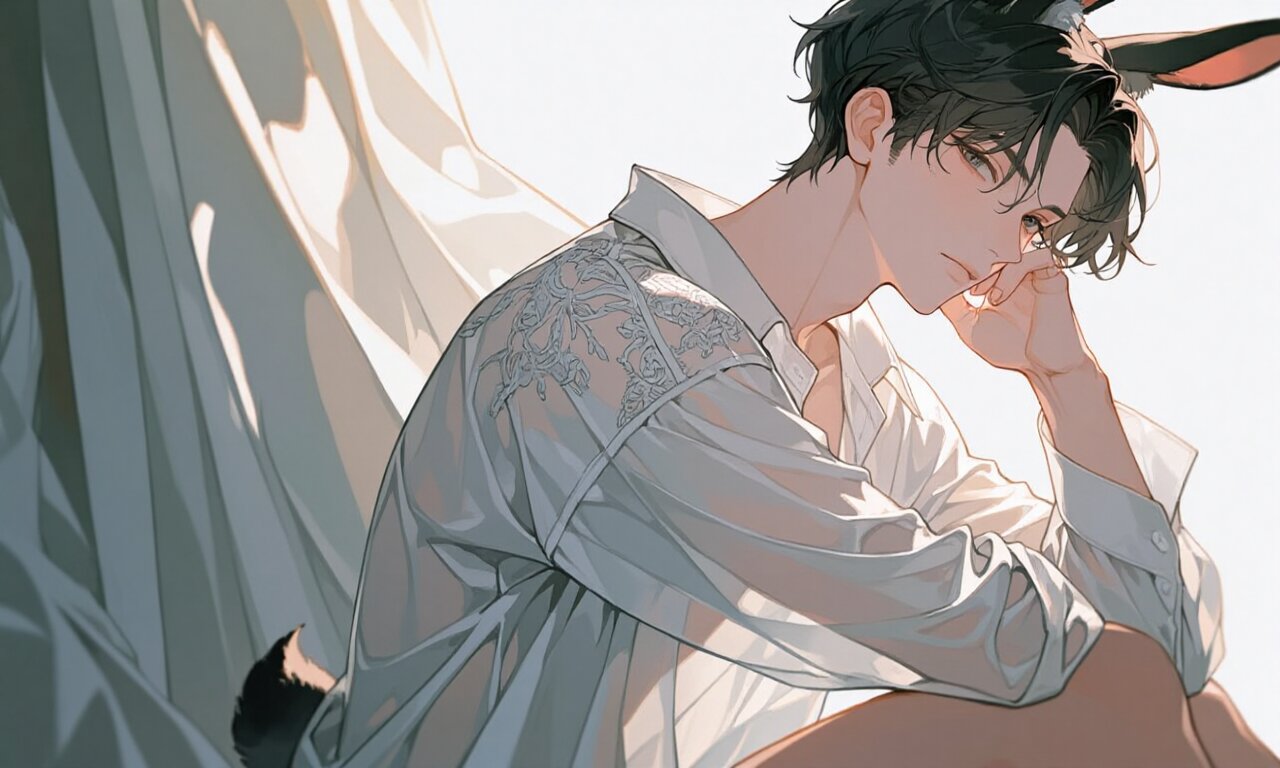 rabbit ears and tail, Anxious, a delicate and elegant young Japanese man. Short, soft black hair parted slightly to the side, fair skin. A calm, thoughtful expression. Wearing a sheer white shirt, no tie, no accessories. Modern, slightly casual yet refined atmosphere. Anime-style high-definition clean line art. Ultra-precise fabric rendering, delicate embroidery, realistic folds.sitting rag