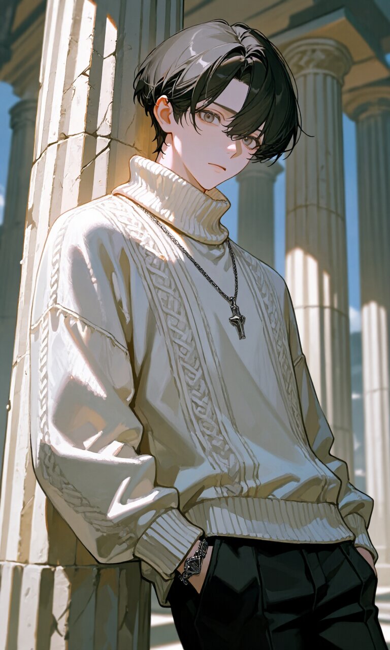 best quality,absurdres,8k,ultra detailed,full body,Anxious, a delicate and elegant young Japanese man. Short, soft black hair parted slightly to the side, fair skin.round eyes, A calm, thoughtful expression. Wearing white knit and black pants,Gothic accessories. Modern, slightly casual yet refined atmosphere. Anime-style high-definition clean line art. Ultra-precise fabric rendering, delicate embroidery, realistic folds.lean against a pillar of Greek architecture