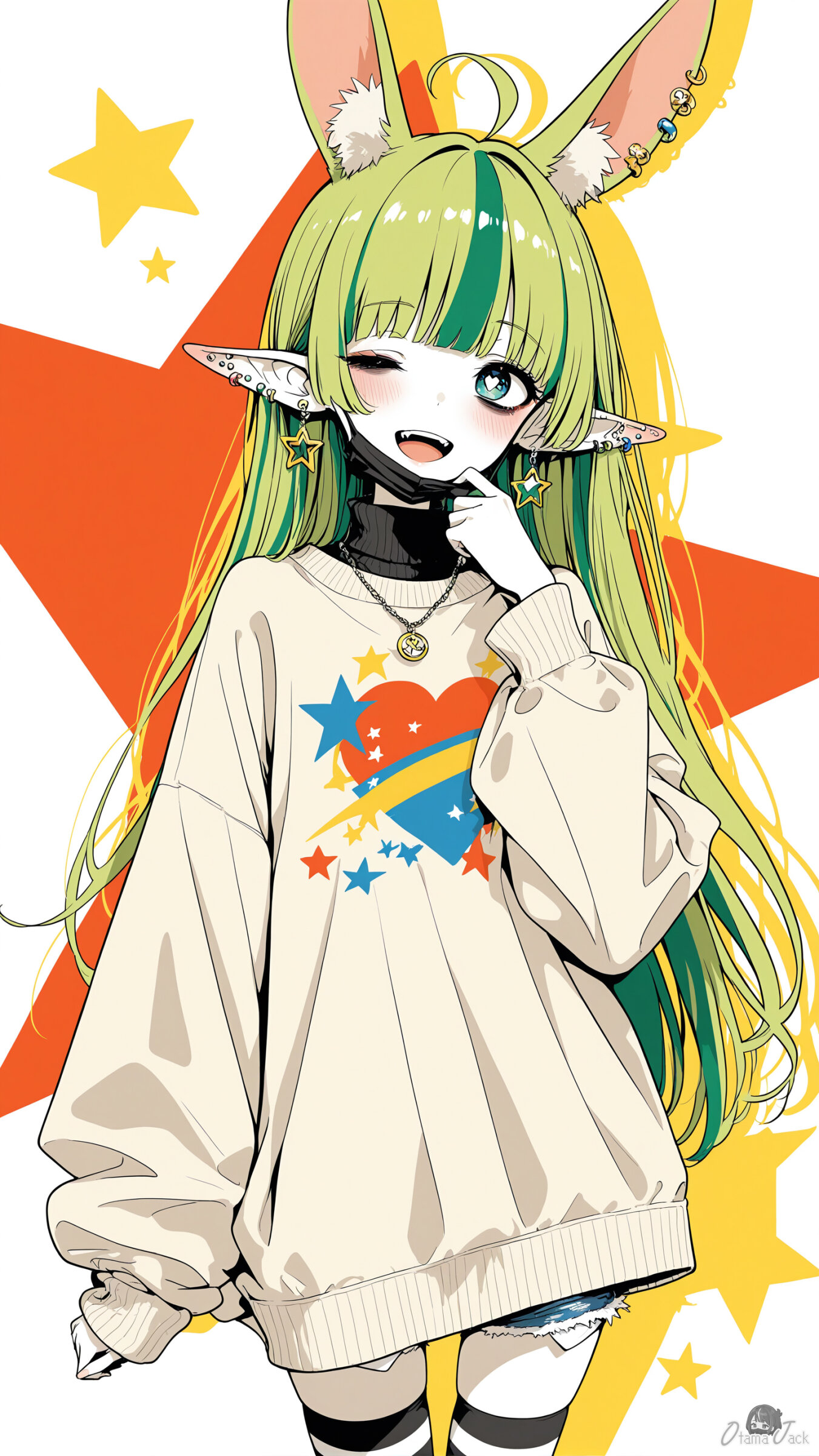 Bunny ears, animal ears, long sleeves, turtleneck sweaters, long-sleeved sweaters,oversize sweaters,shorts, striped stockings, pop artstyle, star (symbol), vibrant, pop art, big lines, red, yellow, blue, line art,