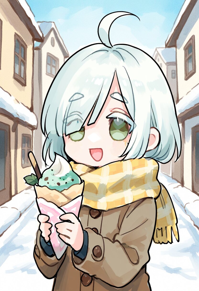 <lora:inmnstyleilxl:0.9>, best quality, masterpiece, very aesthetic, watercolor painting, general, 1girl, chibi, solo, holding crepe, winter town, outside, (bright white hair), short hair, blunt bangs, white thick eyebrow, white colored eyelashes, (hair over one eye), ahoge, mint green eyes, oversize brown coat, yellow plaid scarf, smile, open mouth, upper body