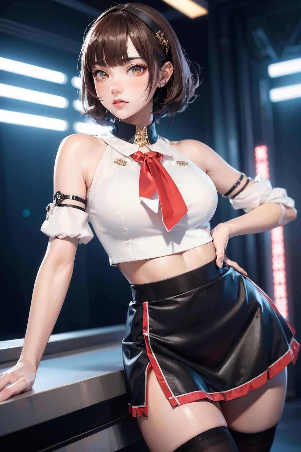 masterpiece, hyper detailed, 8K, hyper detailed illustration,extremely detailed CG, Japanese woman, 23yo,bishojo,idol face, (cute:1.1), (pretty:1.1), hyper detailed face, hyper detailed eye, beautiful eye, eyeshadow, natural makeup, extremely detailed, medium hair,(bangs:1.1), thin, tall, perfect anatomy, perfect proportions, extremely detailed body, blouse, crop top,short skirt, thighhighs, hyper detailed background,