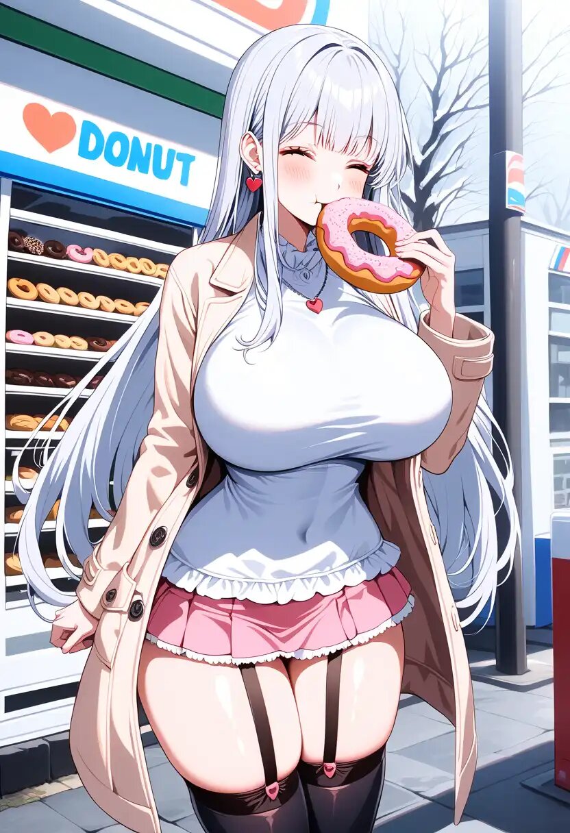 masterpiece, best quality, ultra detailed, 8K, [holding doughnut]++, [eating doughnut]++, [open coat]++, [blouse]+, [huge breasts]++, perky breasts, hanging breasts, curvy, [miniskirt]++, [black thighhighs]+, [garter straps]+, skindentation, cowboy shot, [eating]++, BREAK tall, [long hair]++, [straight hair]++, [shiny]+, [shiny skin]+, [shiny clothes]+, [legs together]++, standing, smile, blush, [closed eyes]++, [In front of the convenience store]++, outdoors, day, snow, snowflakes,