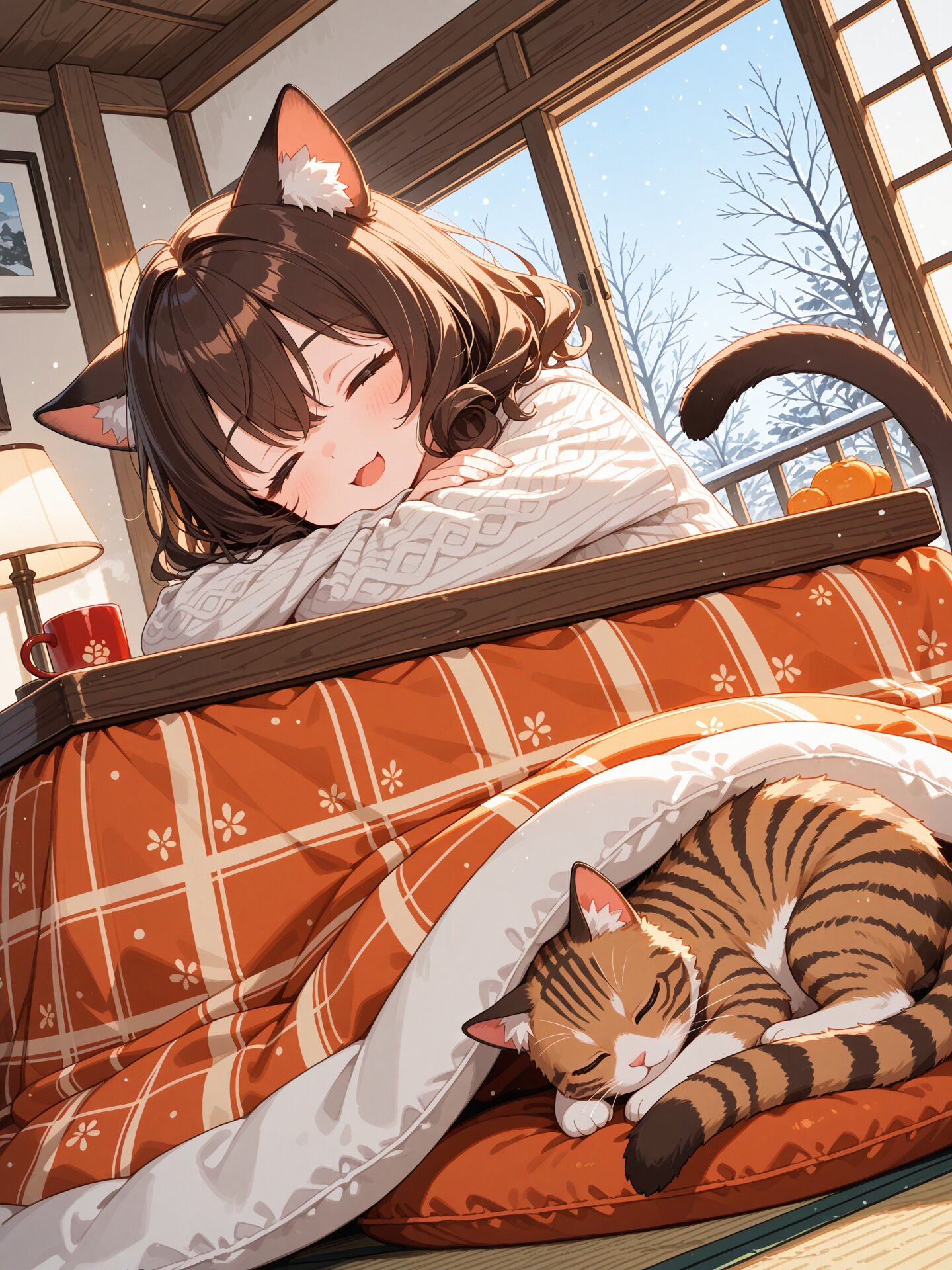 1girl, = =, chestnut brown hair, wavy bob hair, hair between eyes, loose inward curls, cat ears, natural cat tail, :3, open mouth, medium breasts, sleeping cat, dynamic pose, dynamic angle, lying down on a Japanese cushion, (sleeping in kotatsu:1.4), cozy and warm, blanket over lap, winter casual, winter room, snow outside window, soft cozy atmosphere, detailed background, highly detailed, 8k, cozy winter illustration