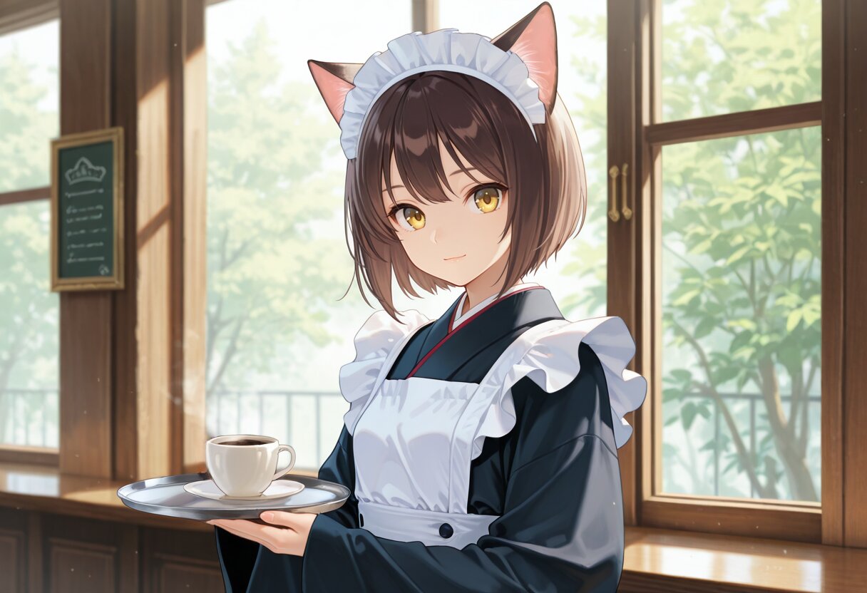 masterpiece,best quality,highres,ultra detailed,highly detailed,8k,general,1girl,solo,17yo,cute,(long sleeves that cover wrists,sleeves past wrists,brown hair, short hair, cat ears, golden eyes,holding coffee on tray),slender,small breasts,light smile,closed mouth,(maid,white maid headdress,long white maid apron,very long kimono),slender girl,looking at viewer,upper body,portrait,in cafe,fantasy,(medium hair:0.8),