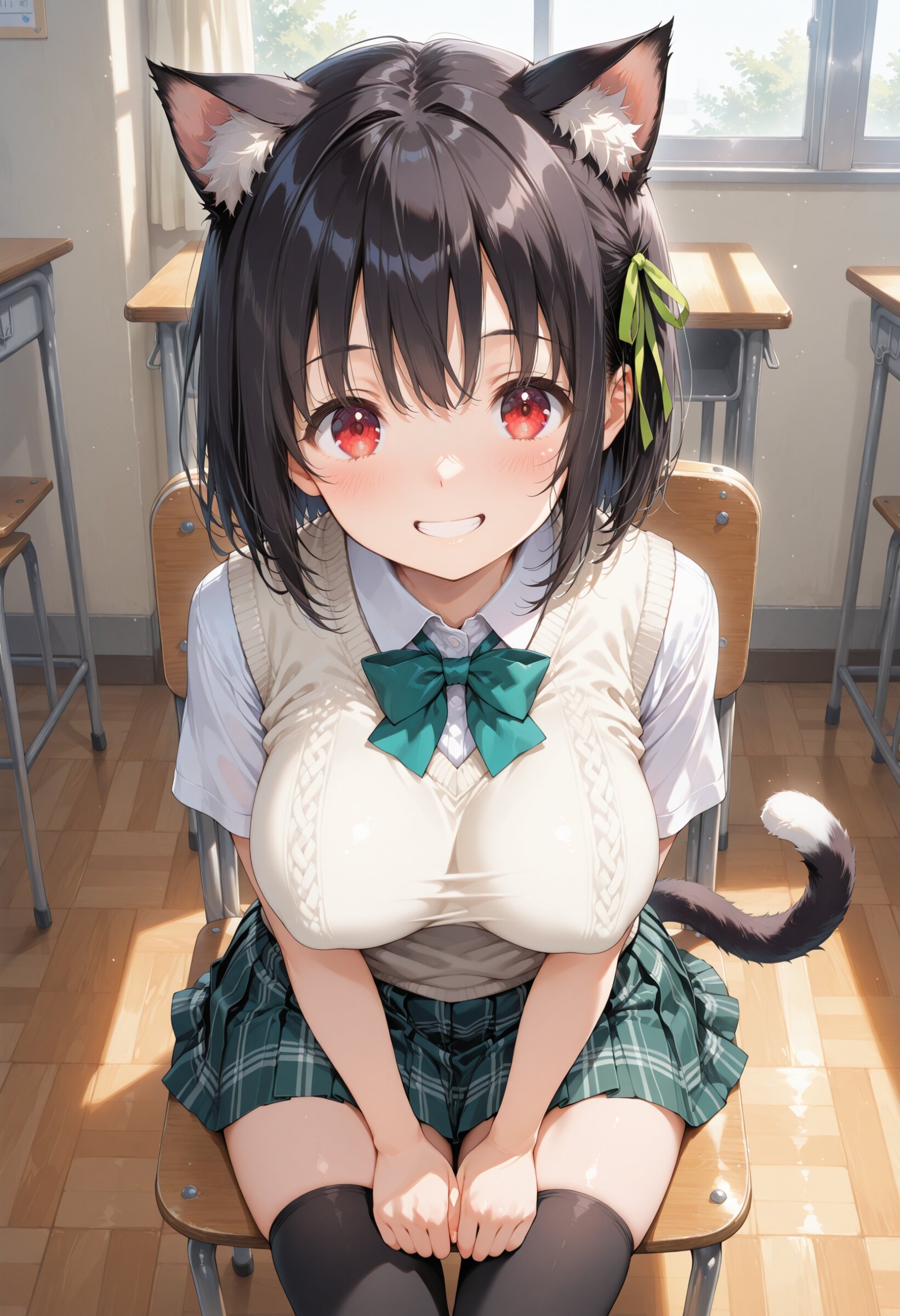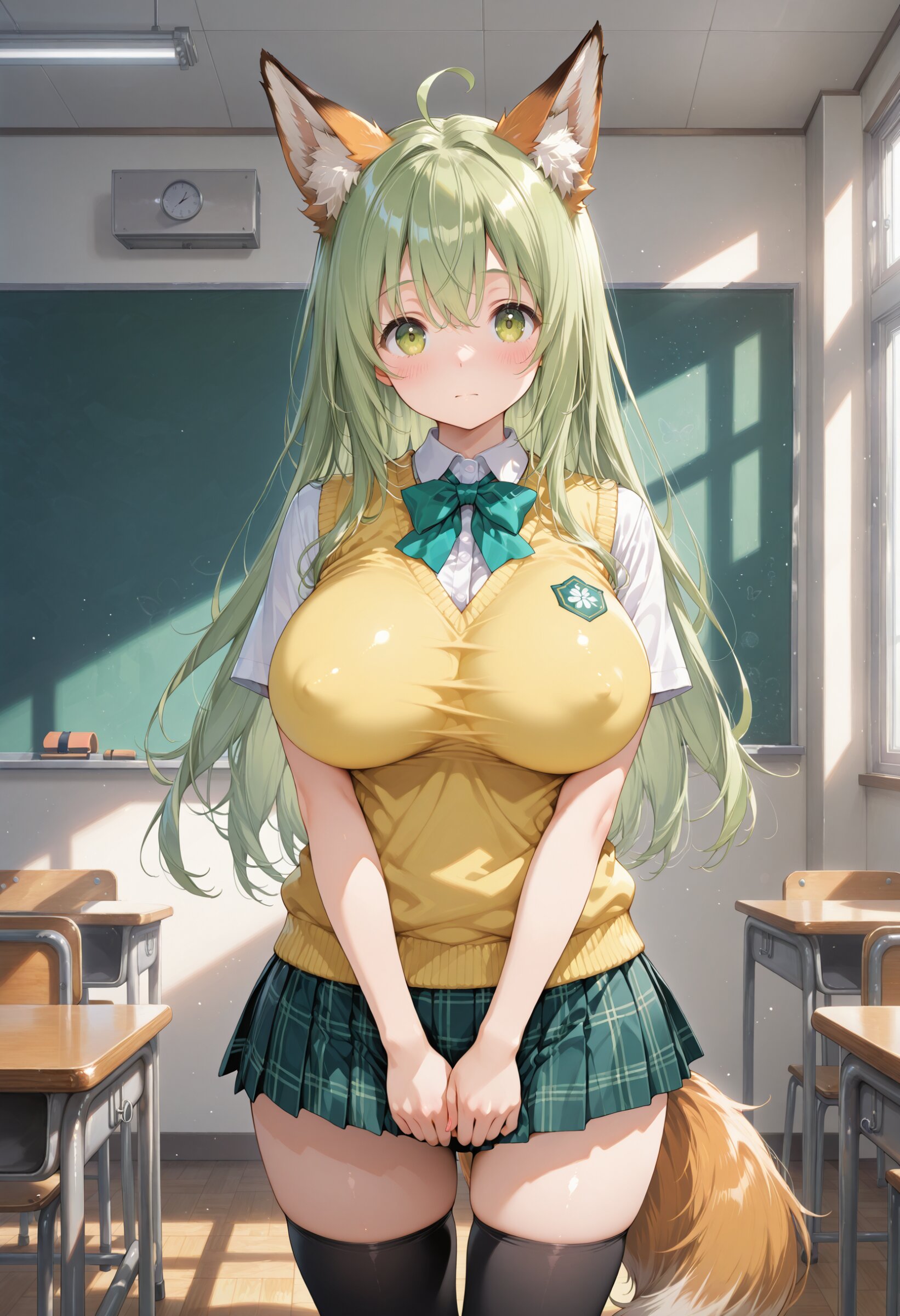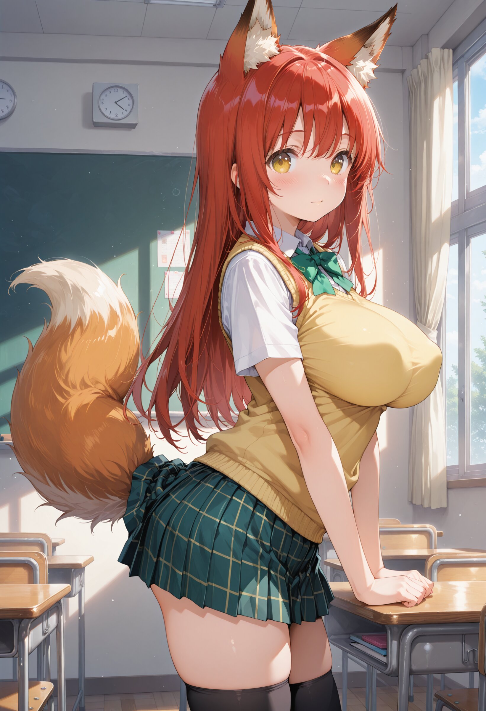 masterpiece, best quality, amazing quality, general, fine detail, official art, 1girl, loli, fox ear, fox tail, red hair, school uniform, short sleeves, green ribbon, green check miniskirt, light yellow knit vest, black thighhighs socks, beautiful legs, big breasts, impossible clothes, (perky breasts:1.2), school, classroom, look at viewer, cowboy shot, innocent expression, from side,