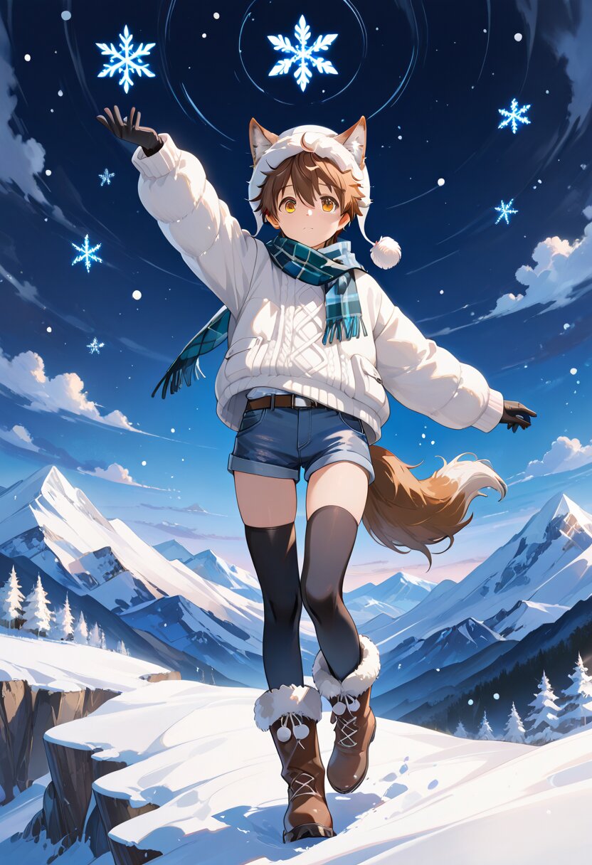 masterpiece, best quality, amazing quality, general, fine detail, official art, beautiful eyes, 1boy, shota, young boy, (wolf ears:1.2), wolf tail, fluffy hat, tartan check scarf, (fluffy knitted top:1.2), black long gloves, denim shorts, zettai ryouiki, thigh gap, black thighhighs, big boots, winter scenery, white snow, at the edge of the cliff, look up at the mountain, Put one hand close to mouth and shout loudly , snowflakes, natural light, cool colors, night moonlight, fluffy texture, drawn to the outline, thoughtful, lively,