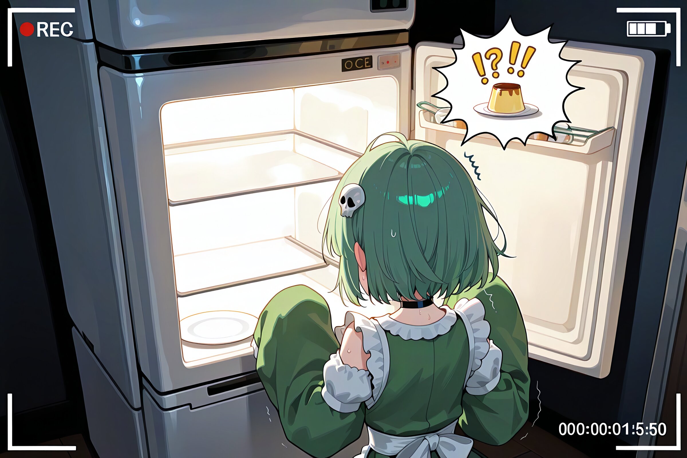 1 little girl, solo, from back, masterpiece, best quality, amazing quality, very aesthetic, cobalt green hair, short hair, messy hair, spoken exclamation mark, trembling, sweat, ^^^, choker, green wa maid outfit, (oversized sleeves:1.2), detached sleeves, (floating black ghosty hands:1.2), skull hair ornament, open the refrigerator, plate in refrigerator, pudding in speech bubble, spoken question mark, spoken exclamation mark, fixed-point camera, recording, in kitchen,night, pudding, flashing, blink, glowing, radiating light, impact effect, shock lines,