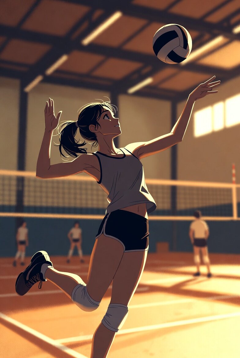 A young woman plays volleyball in a gym, depicted in a dynamic digital illustration.