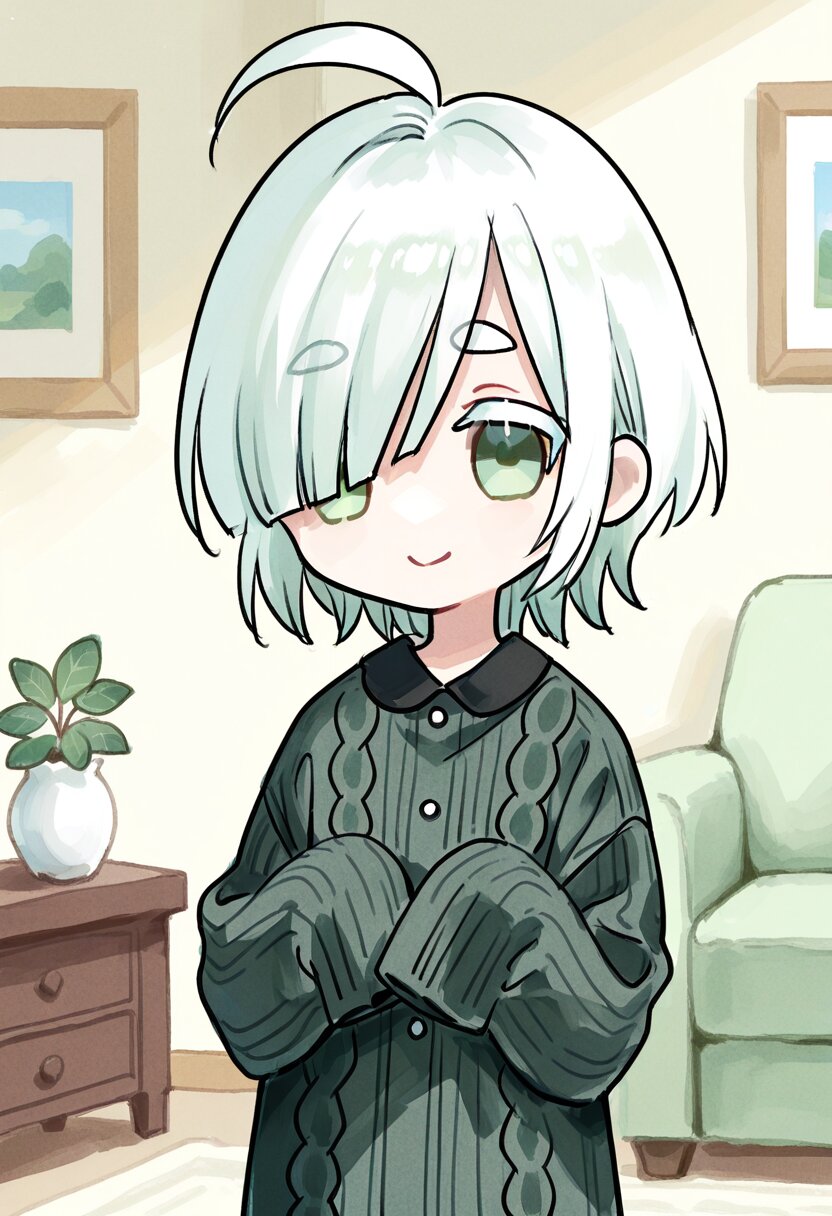 <lora:inmnstyleilxl:0.9>, best quality, masterpiece, very aesthetic, watercolor painting, general, 1girl, chibi, solo, (bright white hair), short hair, blunt bangs, white thick eyebrow, white colored eyelashes, (hair over one eye), ahoge, mint green eyes, oversize black knit dress, sleeves past wrists, sleeves past fingers, smile, upper body, living room