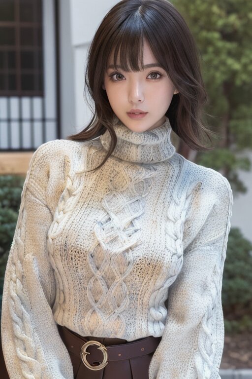 masterpiece, hyper detailed, 8K, hyper detailed illustration, Japanese woman, 23yo, cute, pretty, hyper detailed face, hyper detailed eye, beautiful eye, medium hair,bangs, thin, tall,170cm tall, ((turtleneck long sweater,Hand-knitted Sweater:1.2)),cleavage cutout, sleeve long sweater,thigh, hyper detailed,