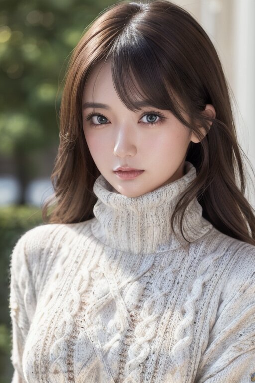 masterpiece, hyper detailed, 8K, hyper detailed illustration, Japanese woman, 23yo, cute, pretty, hyper detailed face, hyper detailed eye, beautiful eye, medium hair,bangs, thin, tall,170cm tall, ((turtleneck long sweater,Hand-knitted Sweater:1.2)),cleavage cutout, sleeve long sweater,thigh, hyper detailed,