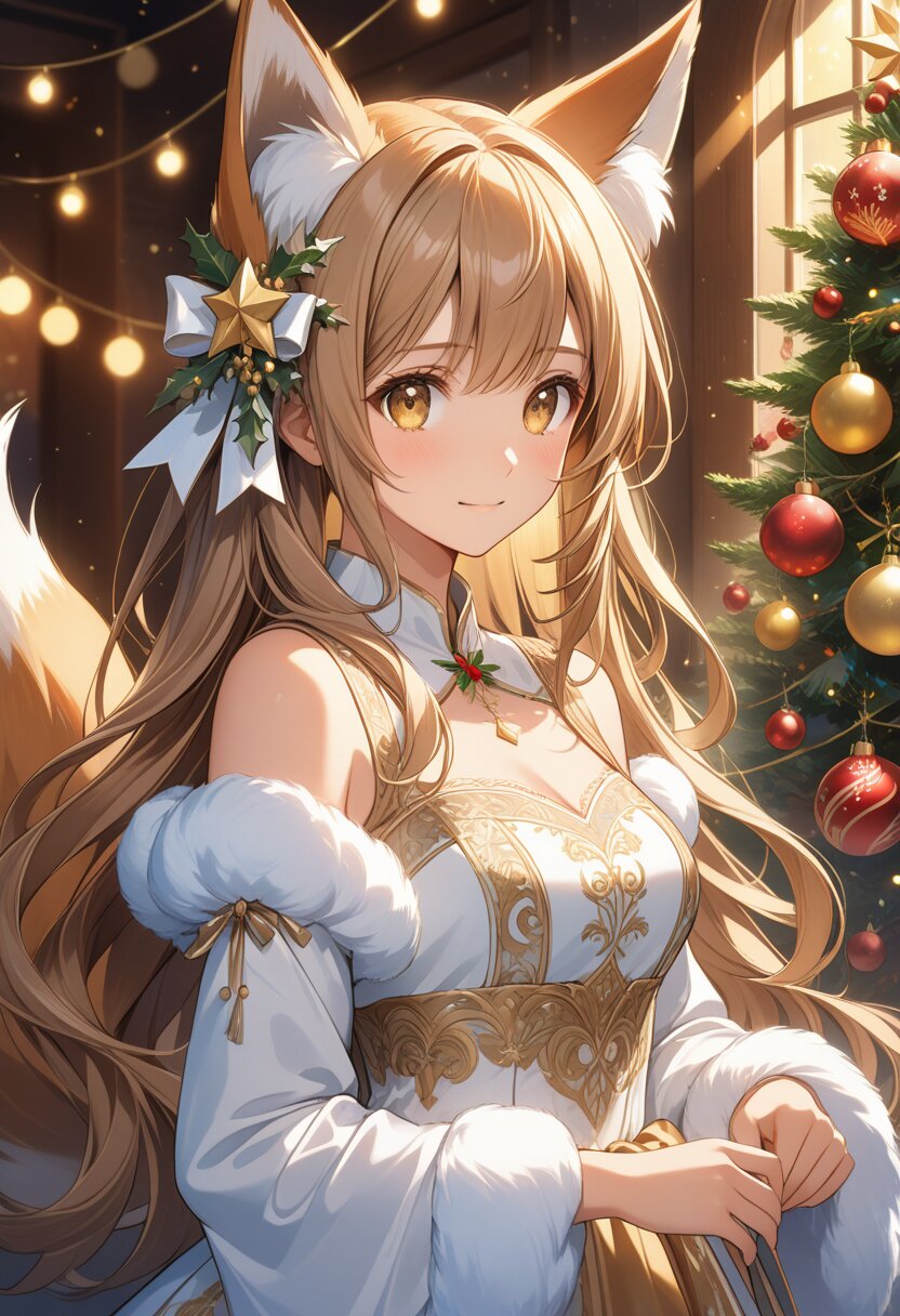 (high resolusion,illustration,ultra detailed 8k art,extremely detailed CG,official art,clothes reflecting light,detailed shiny skin,detailed background:1.3), ((highly detailed beautiful face and eyes),anime_style, fox_ears, girl, light_brown_hair, double_eyelids, long_eyelashes, fluffy_tail, christmas_theme, festive_dress, sparkling_lights, holiday_decorations, cheerful_expression, playful_pose, charming_scene, expressive_eyes, delicate_features, soft_lighting, warm_color_palette, elegant_atmosphere