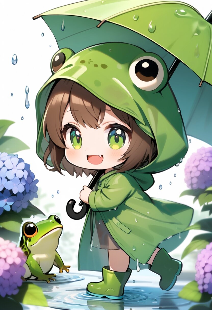 Highly detailed, vibrantly colored, anime-style, 1girl, solo, (chibi style, cute), looking at away, short hair, brown hair, green eyes, fang, open mouth, smile, hood up, green Raincoat, rain boots, umbrella, puddle, splashing, Wet clothhes, sheer, hydrangea, (((frog))), walking, from side,