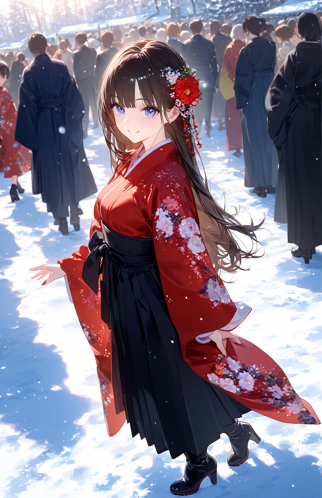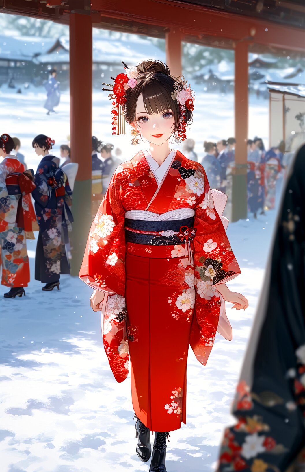 1girl, (extremely detailed CG unity 8k wallpaper:1.2100000000000002), (delicate facial features:1.2100000000000002), (ultra high res:1.2100000000000002), (extremely detailed eyes and face:1.2100000000000002), (perfect anatomy:1.2:1.2100000000000002), (super detailed skin:1.2100000000000002), (super fine illustration:1.2100000000000002), (clothes reflecting light:1.1), (caustics:1.1), (deep shadows:1.1), (faint light:1.1), seijin shiki, 2woman, winter, outdoors, day, sunny, snow field, detailed pale skin, peace sign, smile, japanese traditional clothes, kimono, hakama, furisode with white fur, black long boots, crowd background, taking picture, close up, full body, various lighting, various shadows, varous angle, varous pose, Perfect hand, Detailed hand, eyeshd white furisode, white obi, sash, solo, white floral print, print kimono, realistic, lips, looking at viewer, short hair, indoors kimono, blurry background, hair ornament, flower, red lips, japanese clothes, floral print, portrait, depth of field, earrings, jewelry, kanzashi furisode, jyojifuku, standing, hair flower, black hair, brown hair, black footwear, boots, long hair, high heels, red kimono, bangs <lora:Better hands - SDXL v2.0:0.8> <lora:Eyes_High_Definition-000007:0.77> <lora:furisode_v01e5:0.71> <lora:Kimono:0.67> <lora:furisode hakama_illustrious_V1.0:0.79>