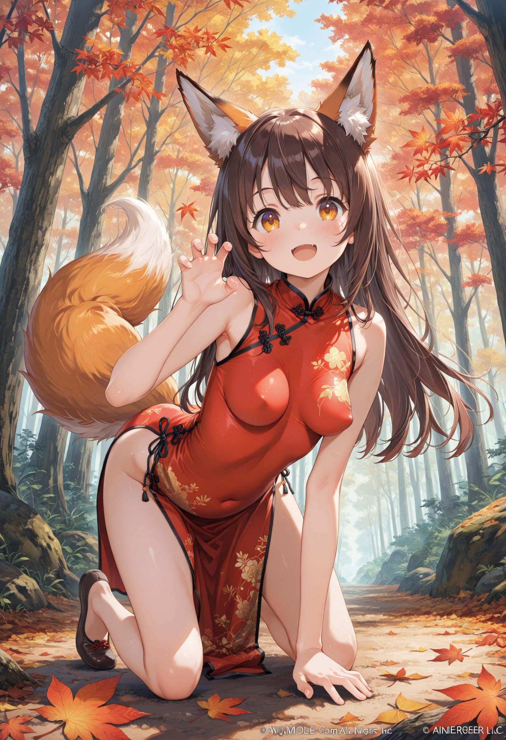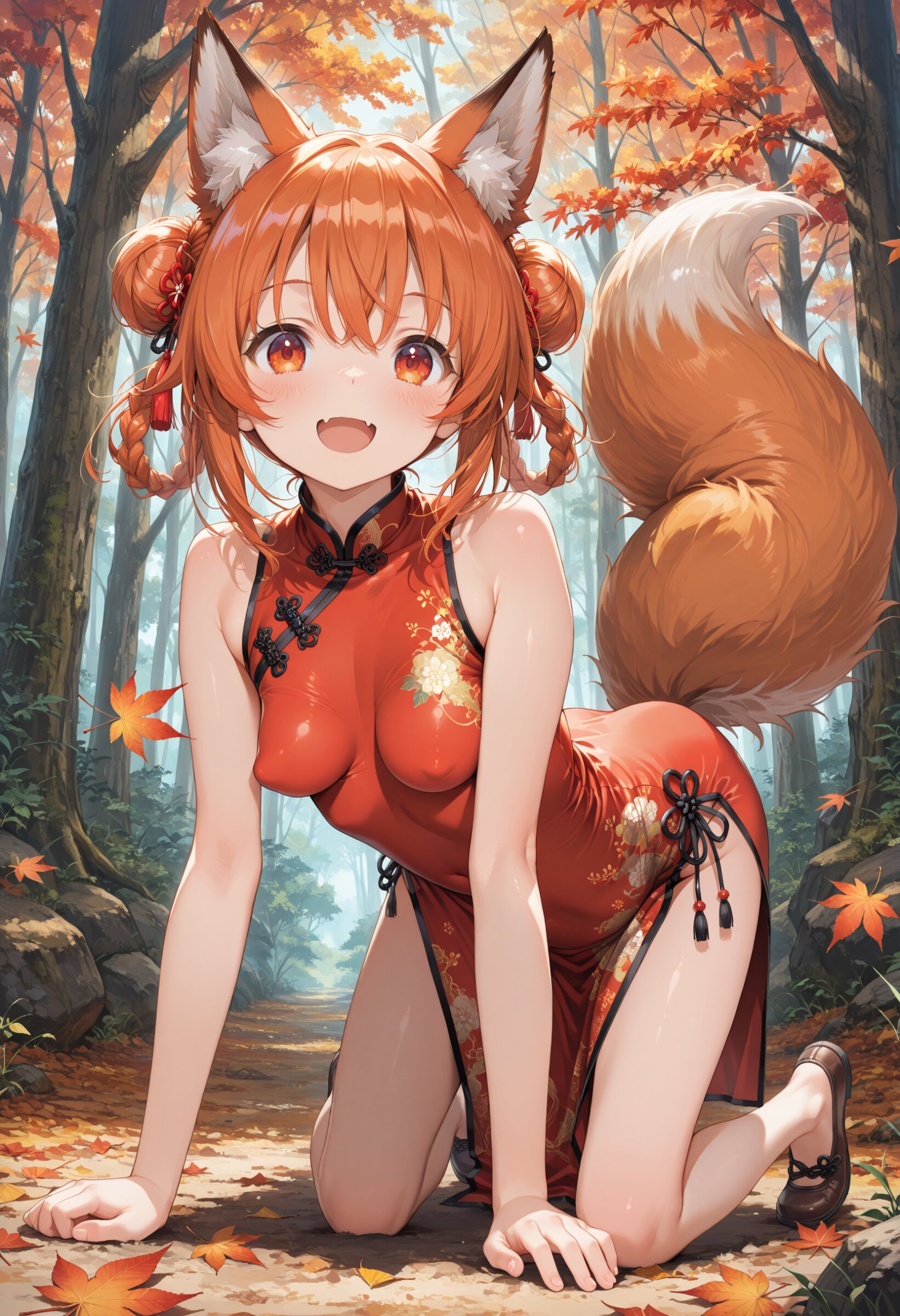 masterpiece, best quality, amazing quality, general, fine detail, official art, 1girl, fox ears, fox tail, china dress, slim legs, big breasts, (perky breasts:1.2), impossible clothes, loli, on all fours, from front, look at viewer, in forest, autumn, happy, claw pose,
