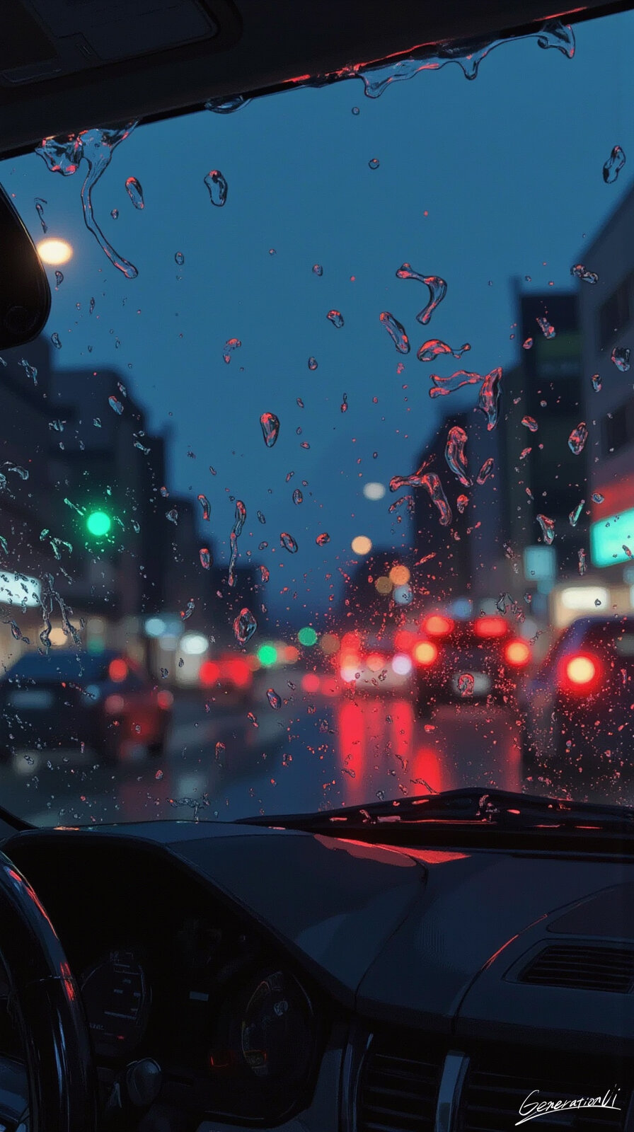 雨粒がフロントガラスを滑り落ちるたび、街の光はゆっくりと形を失い、