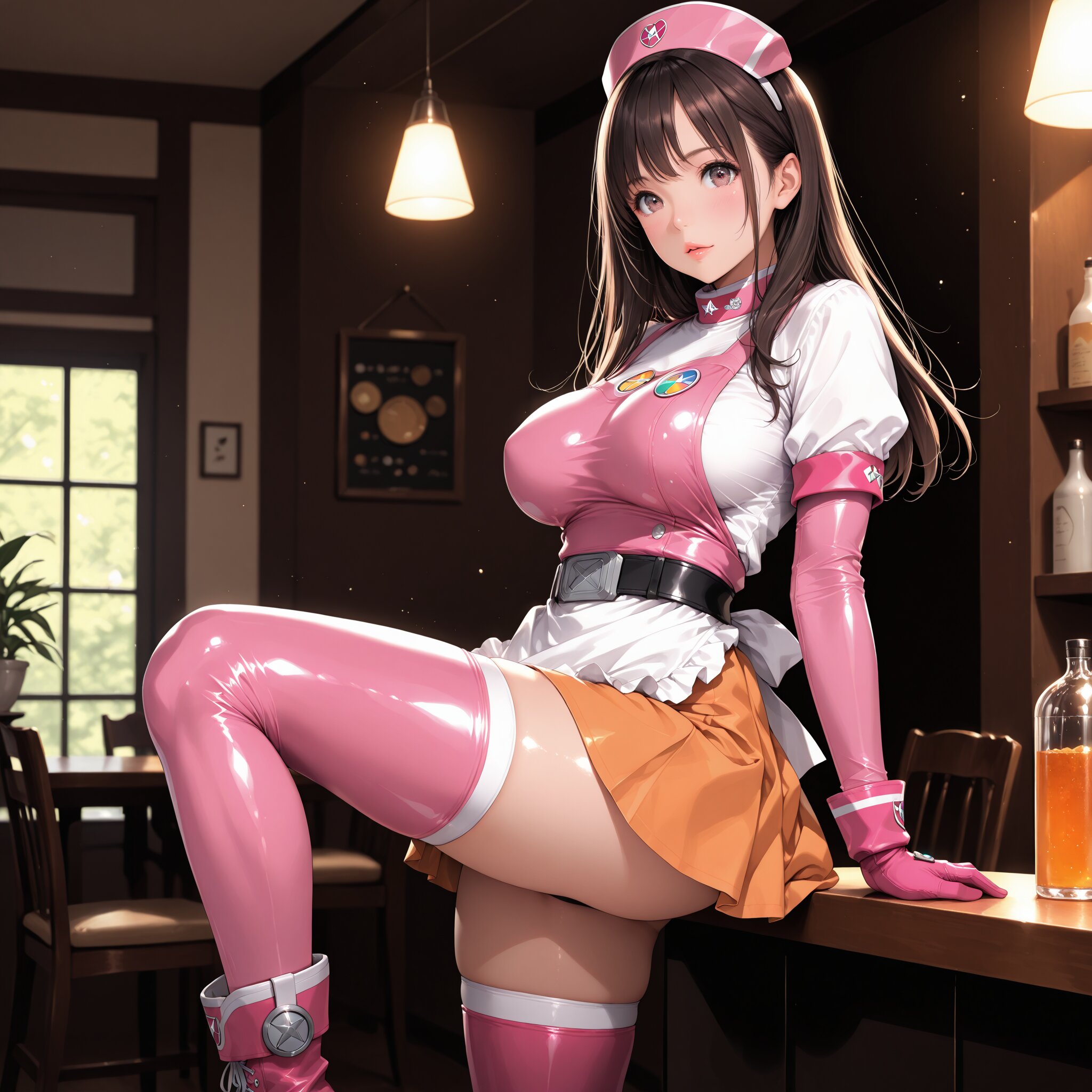 masterpiece, best quality, photorealistic, sharp focus, cinematic lighting, depth of field, beautiful composition, vibrant colors, ultra high res, 8K, highly detailed, masterpiece, best quality, very detailed, 1girl, solo, tokusatsu, (pink ranger:1.3), pink bodysuit, spandex, gloves, boots, belt, hero (waitress, apron,large breasts, orange skirt, (white shirt:1.05),ribon, thighhighs:1.1)