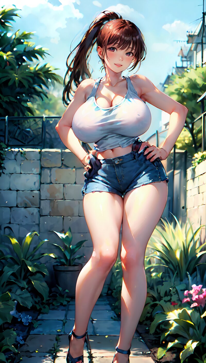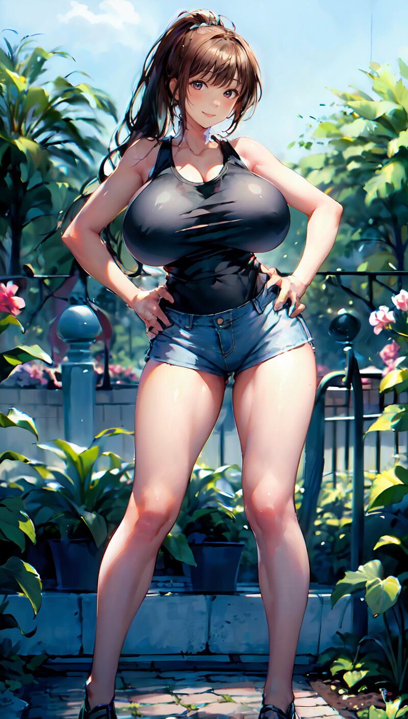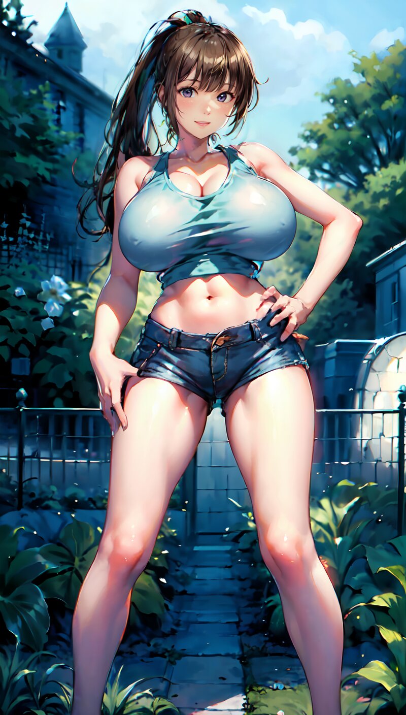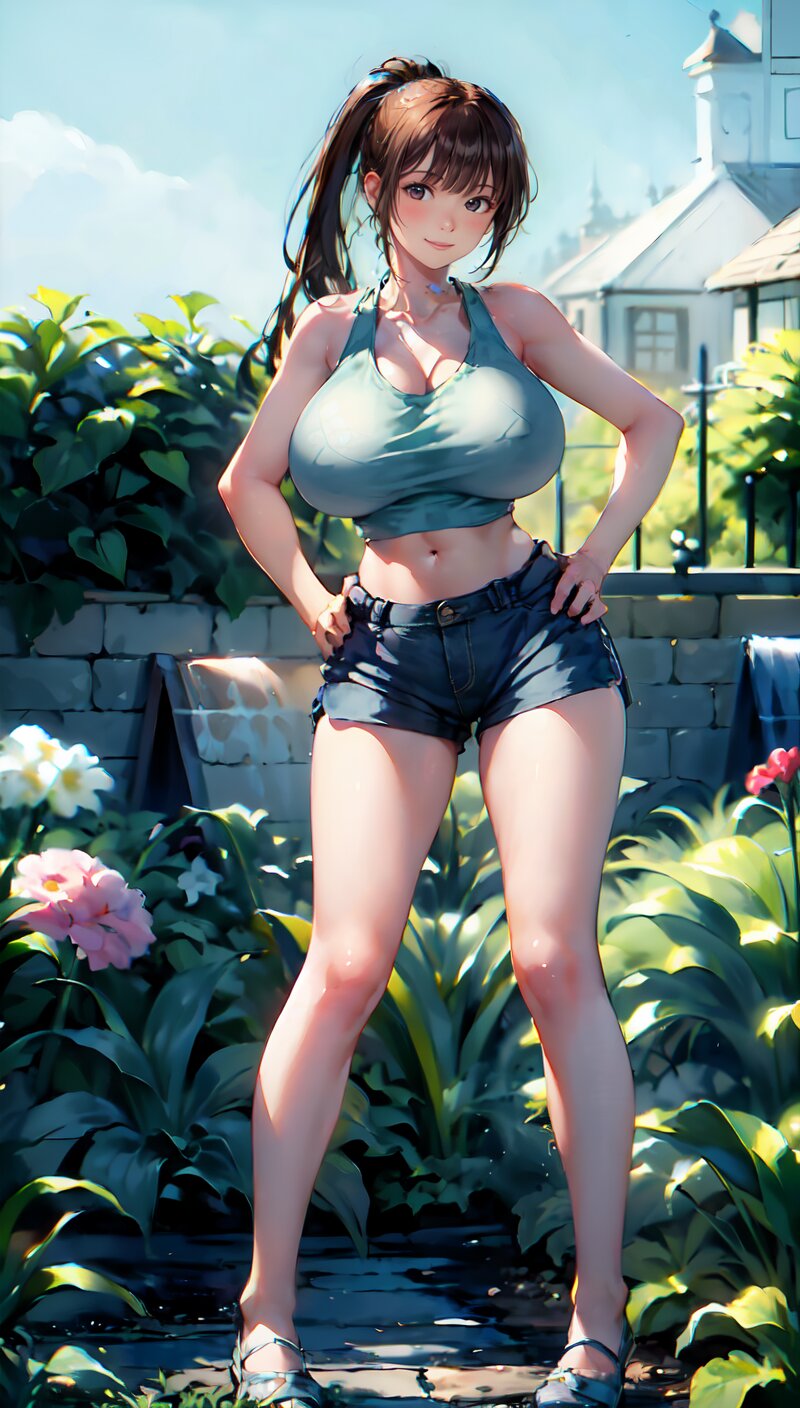 (full body, from below: 1.2), (8k, best quality, masterpiece:1.4), (realistic, photo-realistic:1.6), HDR, (incredibly absurdres:1.2), (vibrant color:1.2), ultra-detailed, 1girl, 16 years old, (glamor, gigantic breasts: 1.8), (ponytail: 1.4), perfect body, highly detailed, shiny hair, looking at viewer, (Tank top and hot pants: 1.6), (standing, spreading legs, hand on hip: 1.8), (in the summer garden: 1.6), <lora:miori_v02:1>