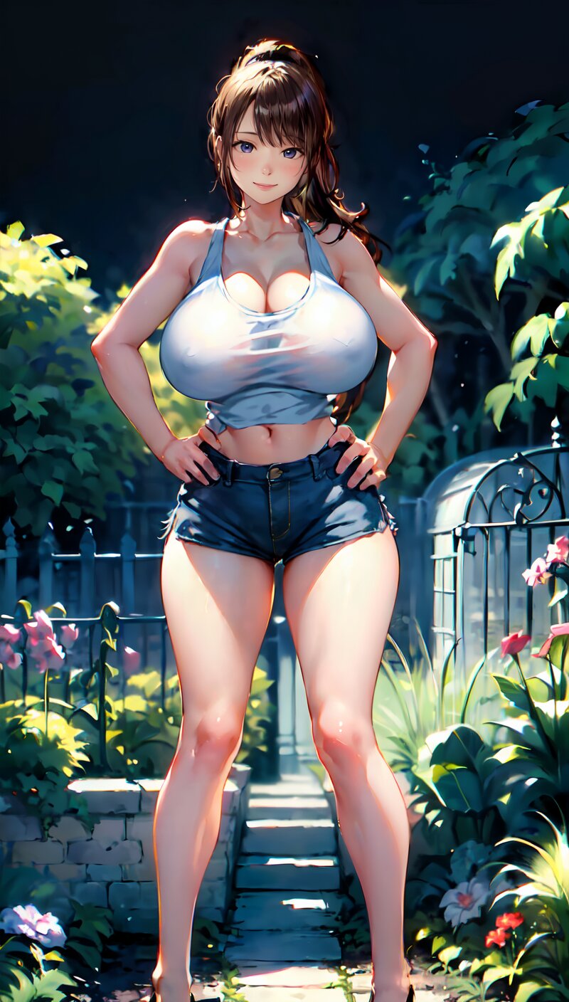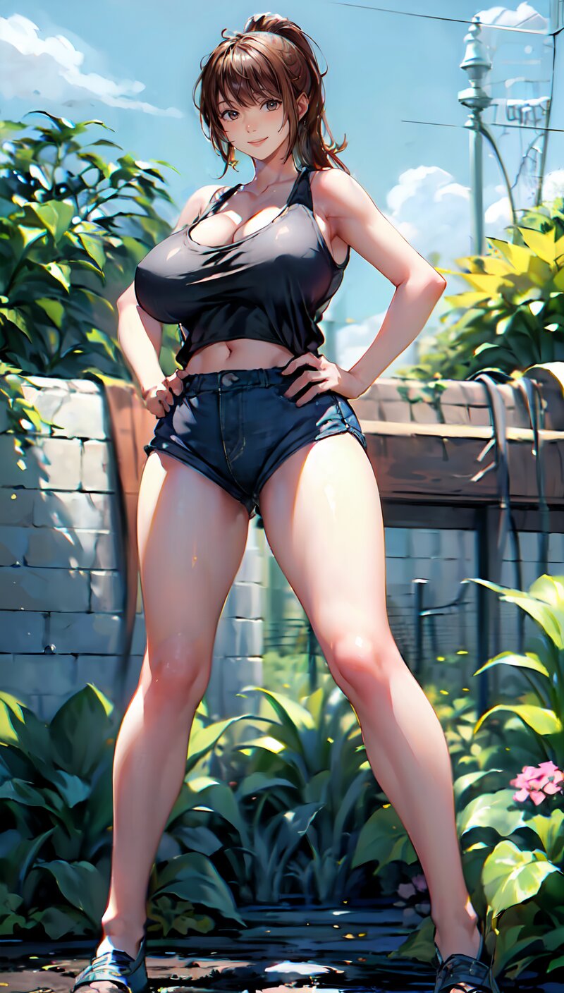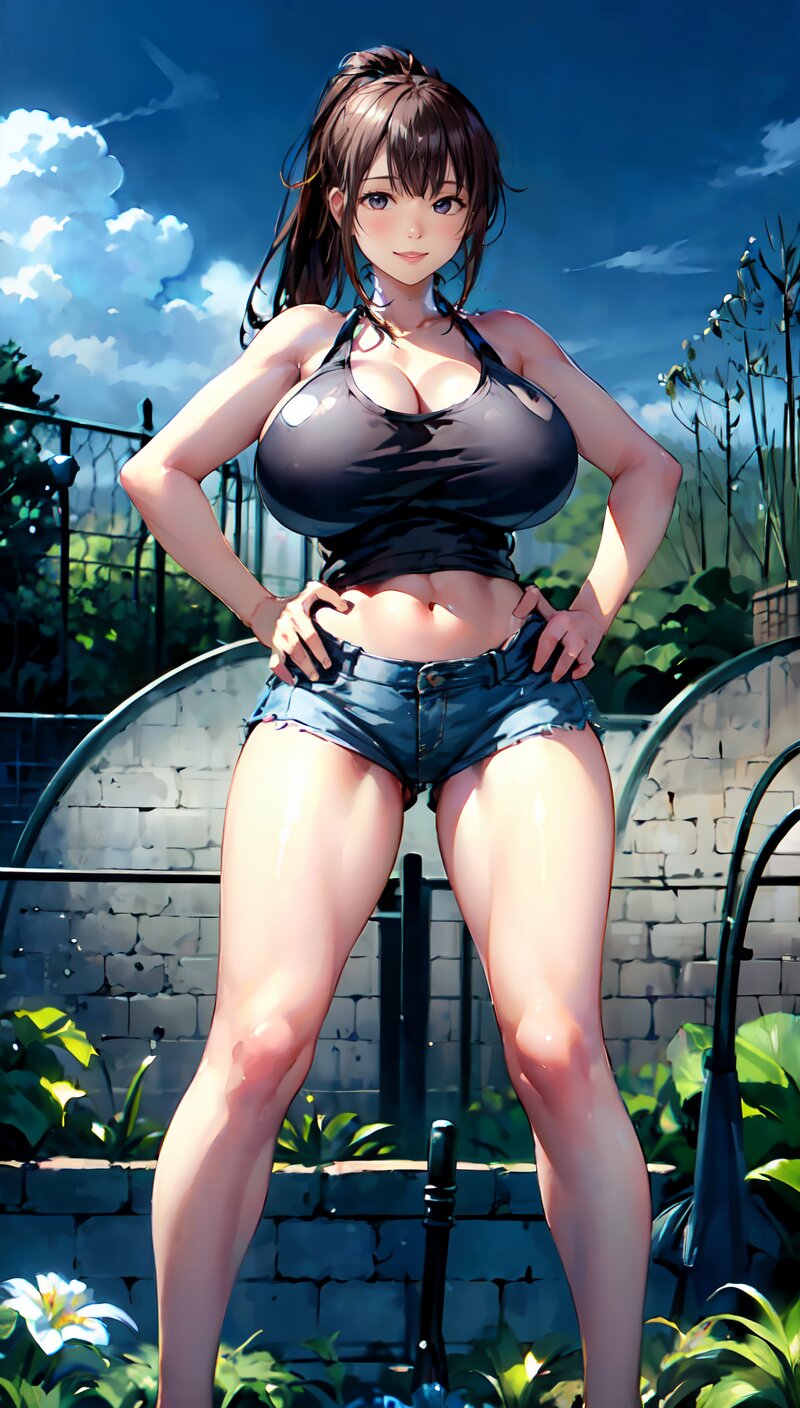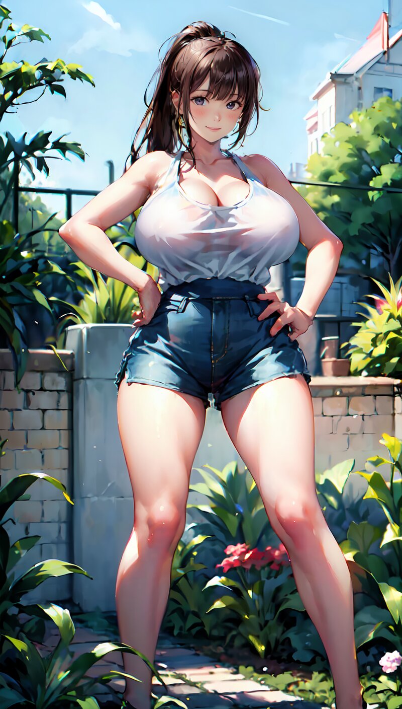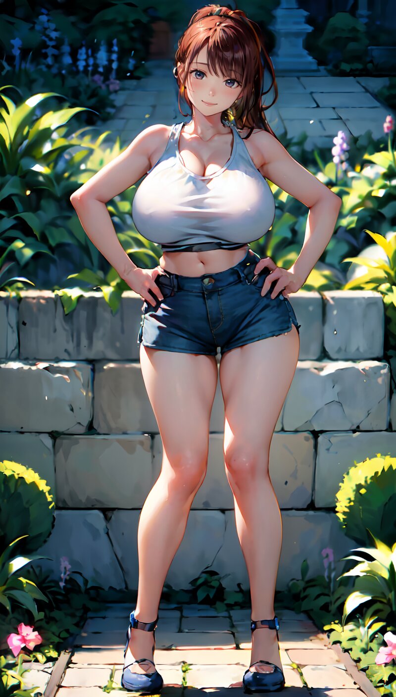 (full body, from below: 1.2), (8k, best quality, masterpiece:1.4), (realistic, photo-realistic:1.6), HDR, (incredibly absurdres:1.2), (vibrant color:1.2), ultra-detailed, 1girl, 16 years old, (glamor, gigantic breasts: 1.8), (ponytail: 1.4), perfect body, highly detailed, shiny hair, looking at viewer, (Tank top and hot pants: 1.6), (standing, spreading legs, hand on hip: 1.8), (in the summer garden: 1.6), <lora:miori_v02:1>