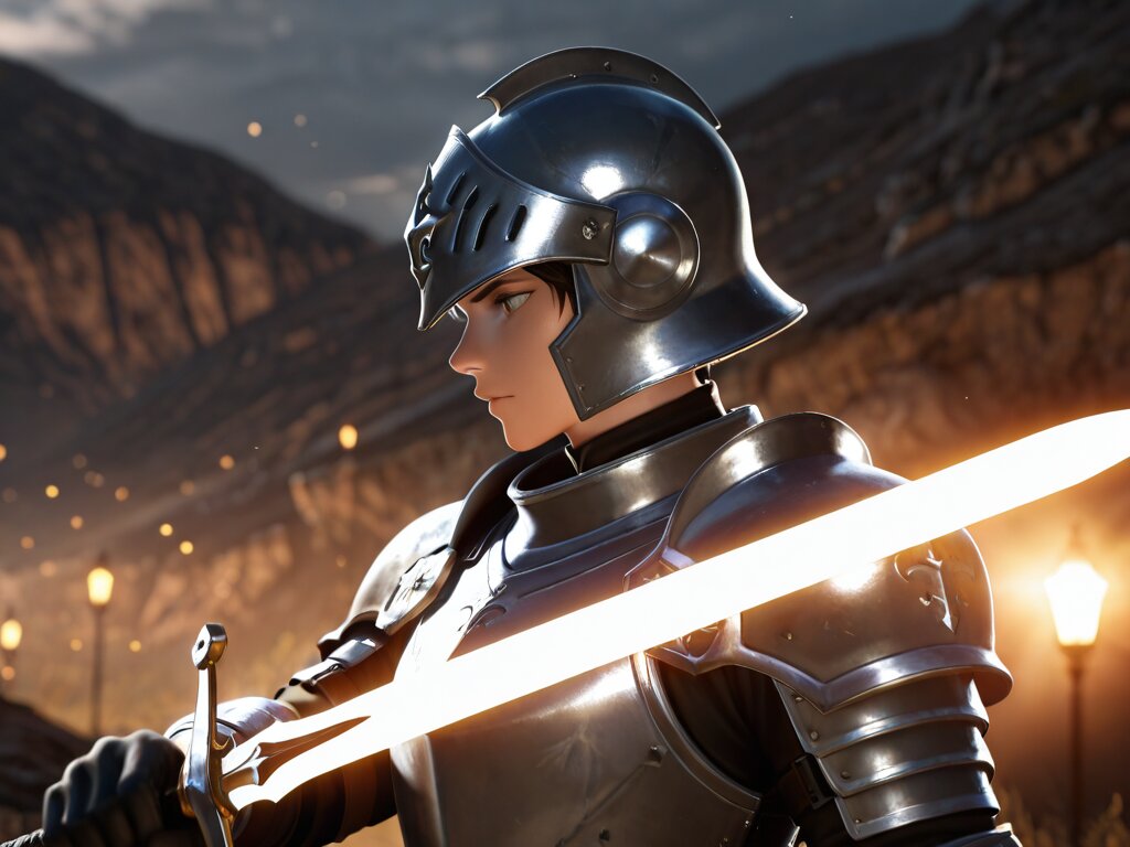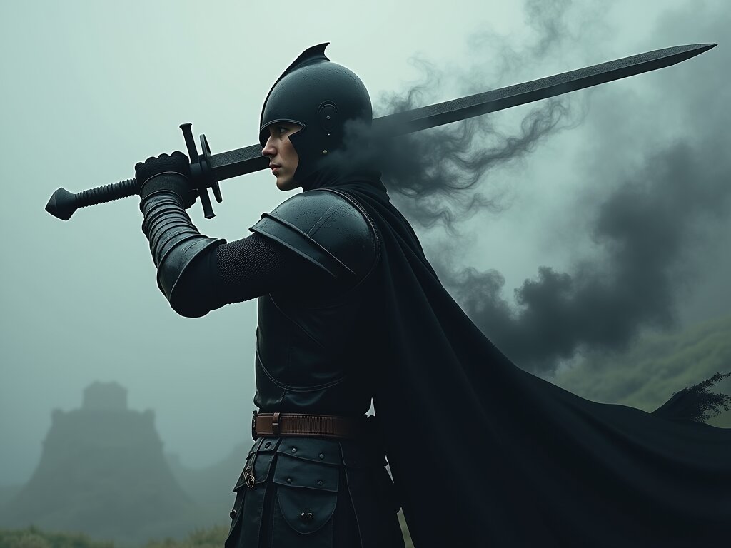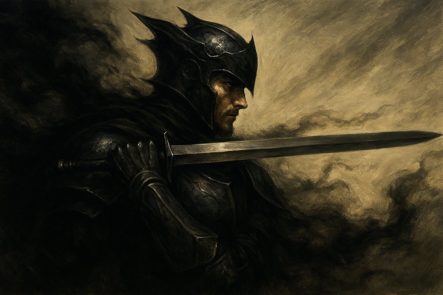 A knight themed around the concept of "The Final Fantasy." A male warrior is shown in profile, holding a sword horizontally across his face. He wears a black helmet and black armor, gazing sharply in the direction he faces. Wind blows from that direction, and black smoke-like wisps trail around him, carried by the wind. The background is a world wrapped in fantasy and mystery.