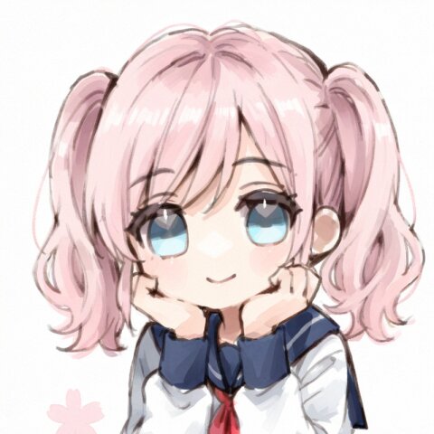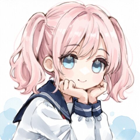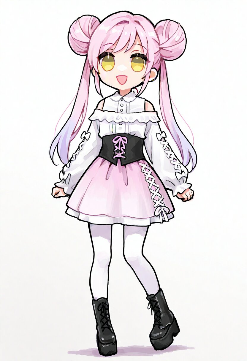 <lora:inmnstyleilxl:0.9>, best quality, masterpiece, very aesthetic, watercolor painting, general, 1girl, chibi, solo, light purple to light pink gradient hair, long twintails with double bun, round eyes, yellow eyes, white longsleeves blouse, lace-up sleeves, sleeves past wrists, offshoulder, black lace-up corset, pink flare skirt, side lace-up skirt, white tights, black platform boots, smile, open mouth, white background