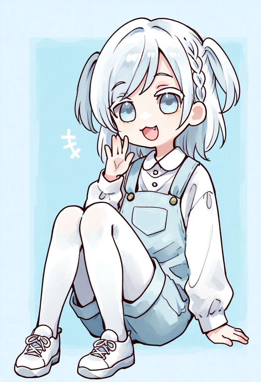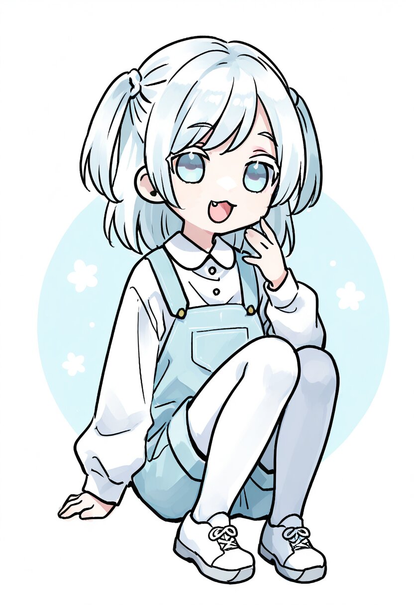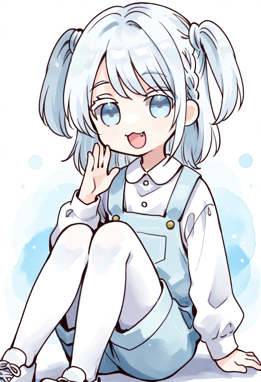 <lora:inmnstyleilxl:0.9>best quality, masterpiece, very aesthetic, watercolor painting, general, 1boy, chibi, solo, white hair, two side up, medium hair, braid bangs, swept bangs, pale blue eyes, white colored eyelashes, :3, fang, white longsleeves blouse, light blue overall, white tights, white shoes, smile, open mouth, knees up, hand up