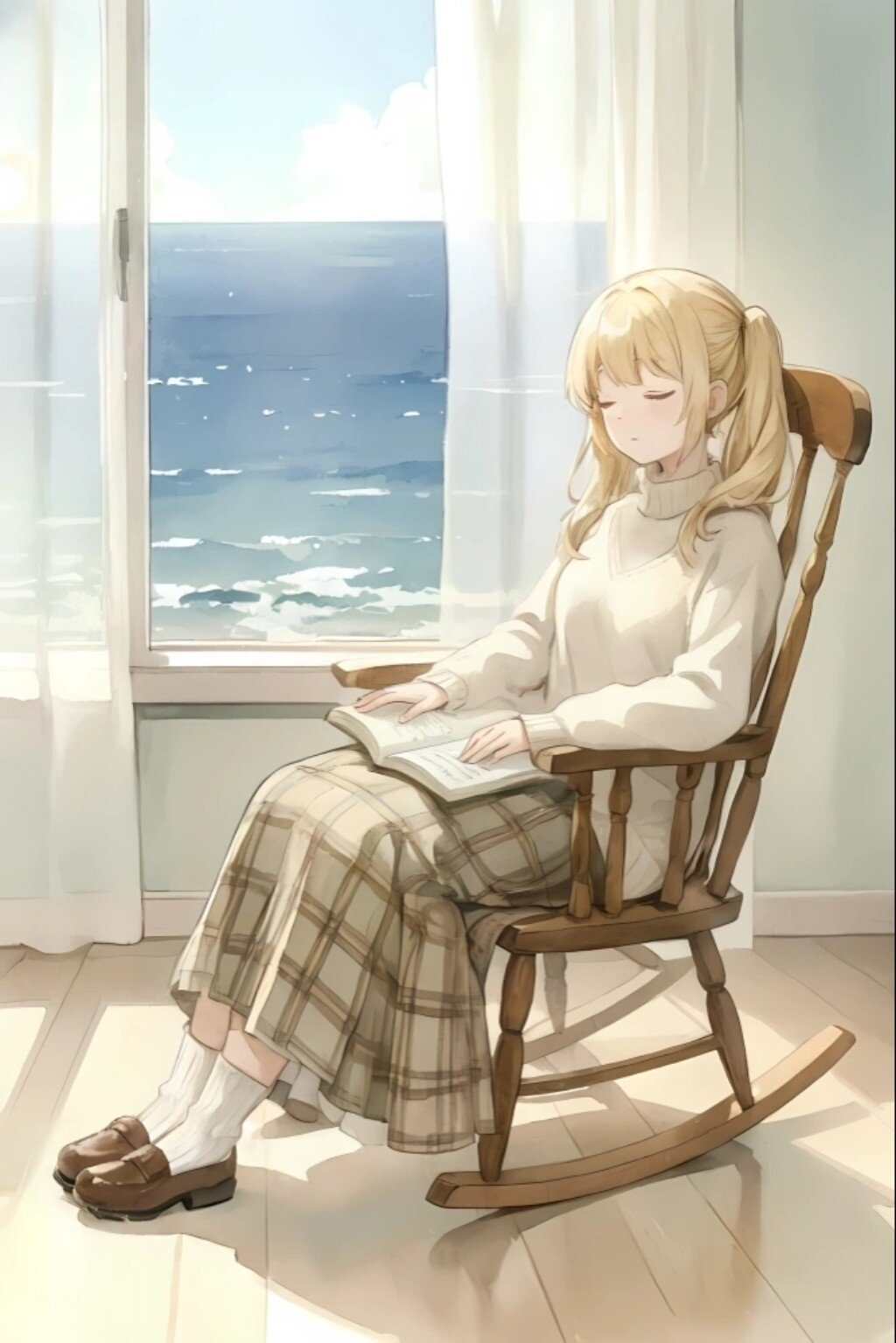 A watercolor anime-style illustration of a young blonde woman sitting in a wooden rocking chair by a large window overlooking the ocean. She has her hands resting gently on an open book in her lap, and her eyes are closed, suggesting peaceful contemplation or sleep. She wears a cream-colored turtleneck sweater and a long plaid skirt. The room is brightly lit by natural light, casting soft shadows. The ocean outside is a calm blue with a clear sky.