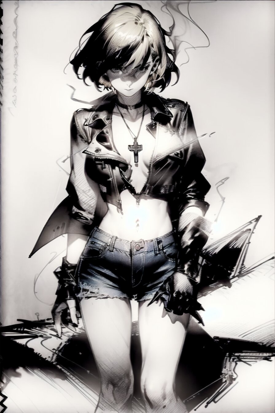 ((ultra high resolution,extremely detailed CG,official art,cinematic shadow,cinematic lighting,)),1woman,blonde short hair,smoking,Low-rise denim shorts,,black leather jacket inner no clothes,looking away,Caucasoid,cross necklace, <lora:pensketch_without_pen_lora:1>penSketch_style, monochrome, ink sketch,