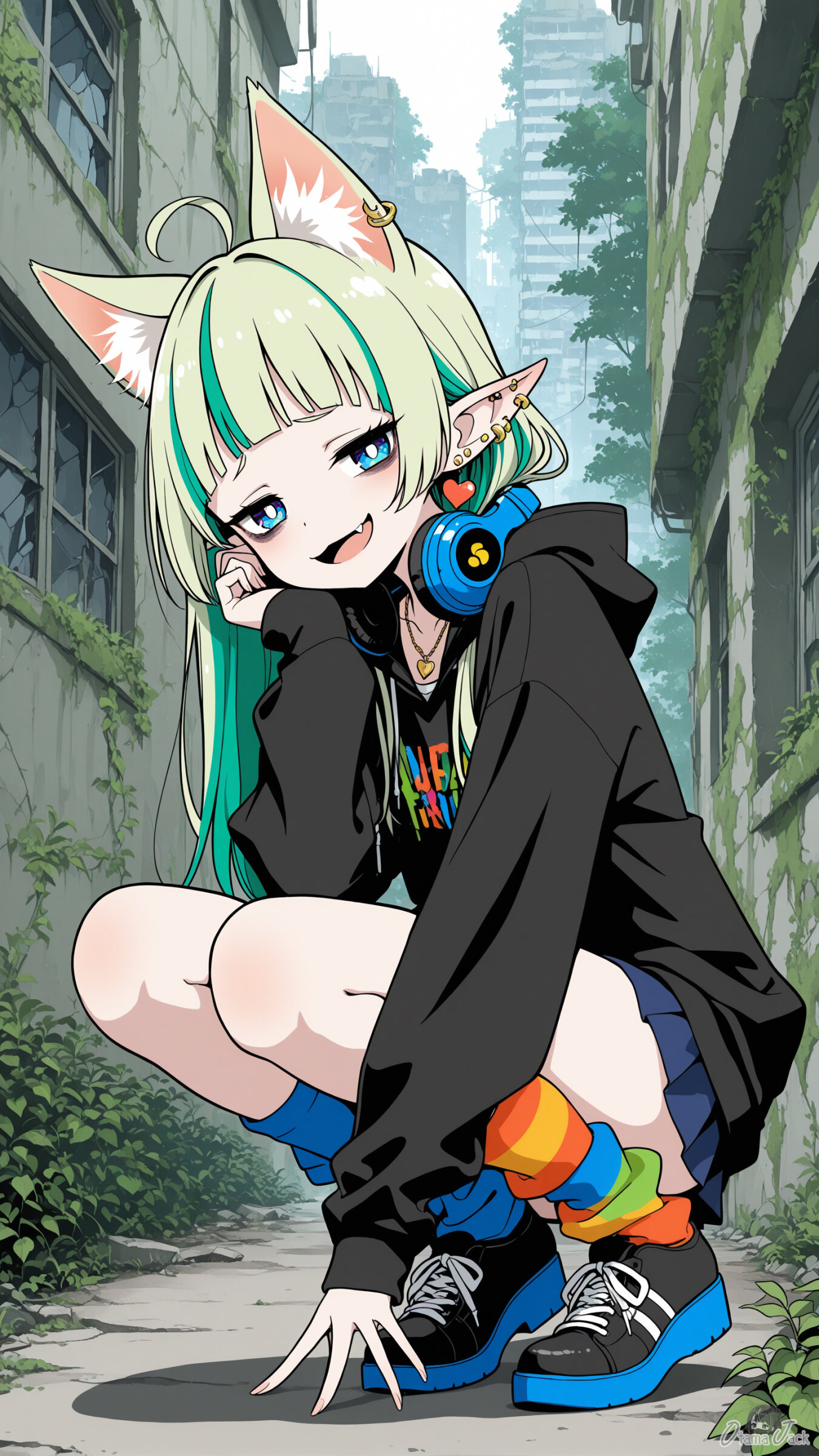 Headphones around the neck, hood, hoodie, skirt, striped, polka dot, asymmetrical legwear, mismatched legwear, multicolored legwear, shoes, BREAK smug, skin fang, hand to own mouth,spiral eyes,@ @,Open mouth, wolf ears, full body, crouching pose, one hand touching ground, alert forward gaze, slight lean, raised heel, ready-to-move stance, subtle tension in limbs, animal-like posture, quiet tracking movement, BREAK jungle-urban hybrid city, overgrown vines on buildings, moss-covered concrete, broken windows, dense foliage creeping over rooftops, abandoned streets, soft mist, tall ruins with greenery, wild nature reclaiming cityscape, quiet overrun atmosphere,