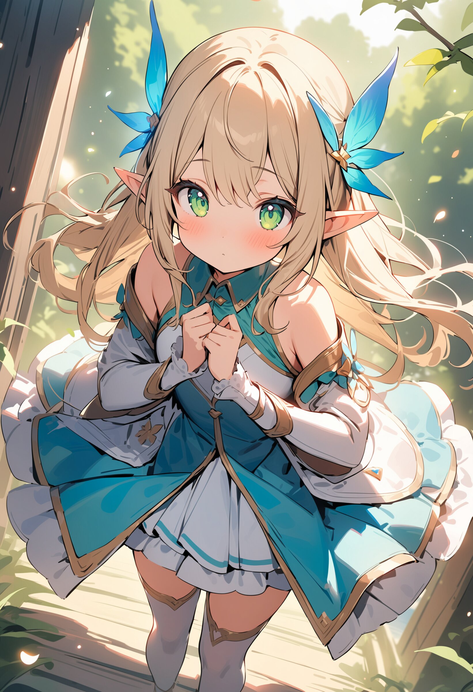 ((masterpiece)), ((best quality)), ((kawaii)), cute, (lovely), ((extremely detailed)), (beautiful), dynamic angle, a cute girl, 1girl, solo, ((elf )),beautiful blond hair, beautiful green eyes, ((beautiful eyes)), long hair, fantasy clothes,