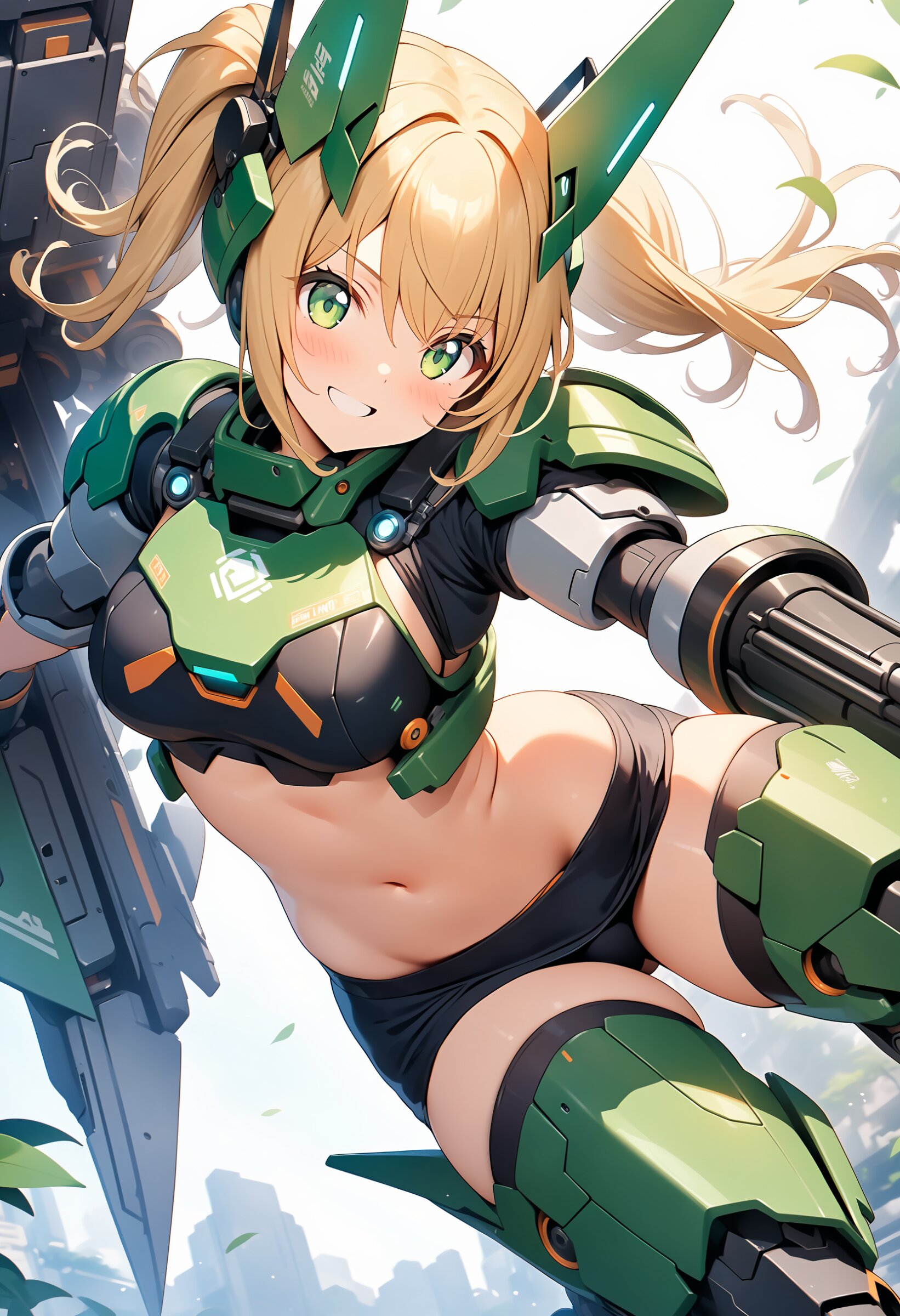 1girl, ((white background)), ultra detailed 8k cg render, masterpiece, high resolution, extremely detailed, mecha musume,mecha shoulder, mech leg, headgear, mecha armor, ((mini skirt)),long blonde hair, dropping green eyes, smile, dynamic posing,