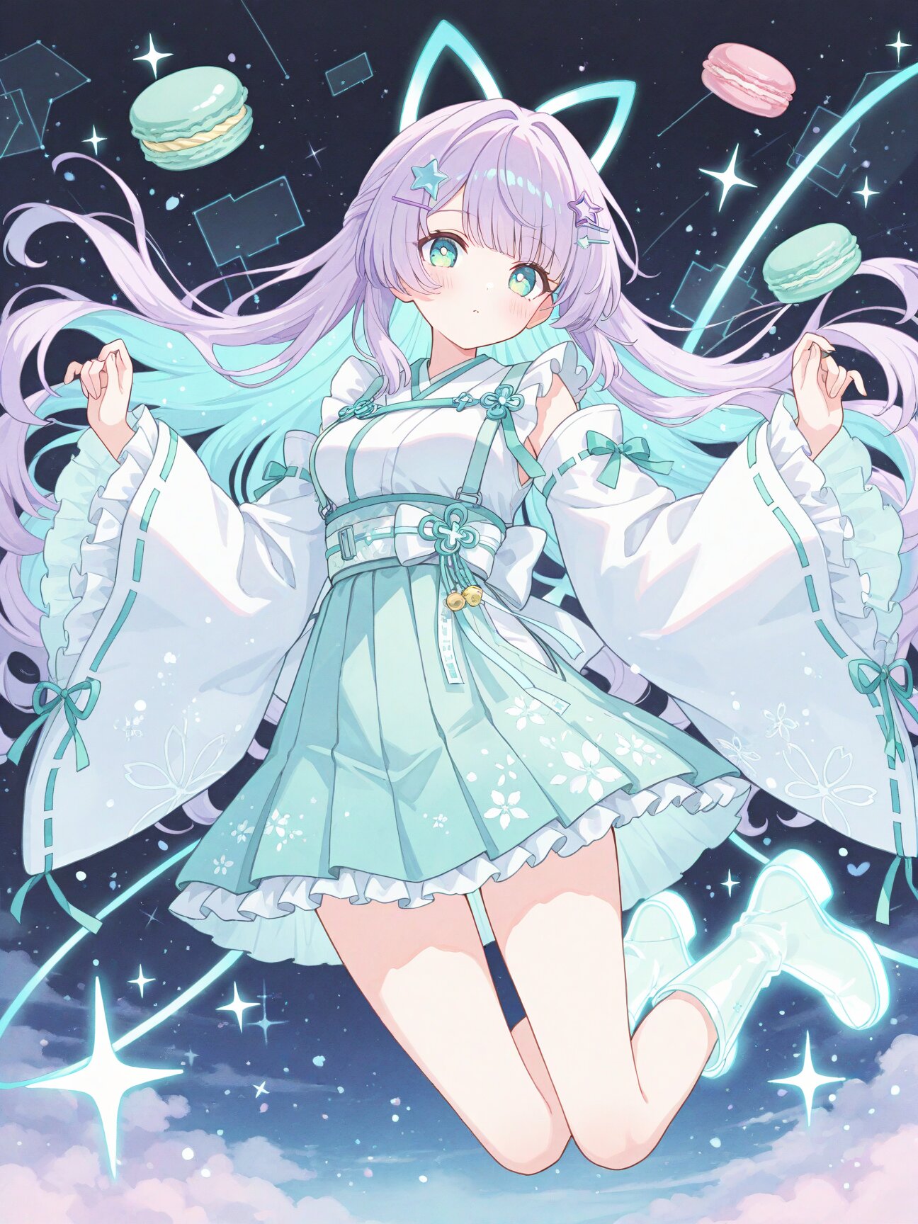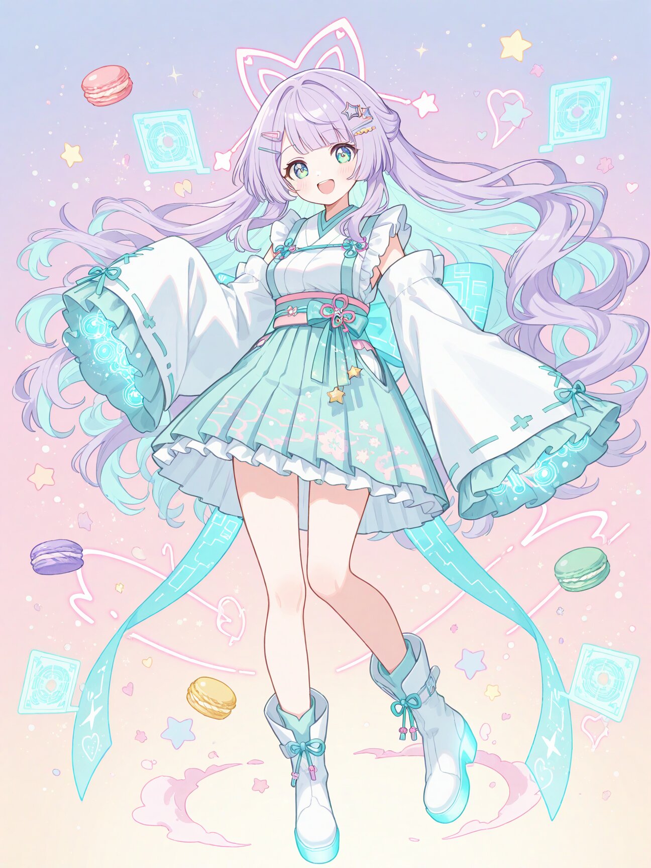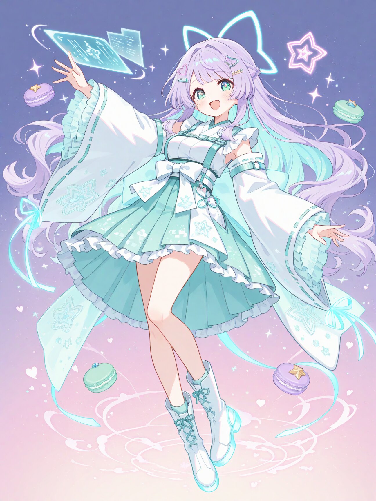 futuristic cyber-neon miko outfit, white and pastel-lavender base with glowing mint and pink circuitry patterns, short modern kimono top with holographic gradients, wide sleeves with neon edge-lighting, pastel obi belt with floating hologram charms (stars, hearts), long ribbon ties that emit soft glowing particles, skirt layered like miko hakama but shorter and airy, translucent pastel panels, delicate frills mixed with tech plating, knee-high boots inspired by traditional tabi but glossy and cyber-styled, glowing soles, hair accessories: star-shaped miko hairpins, glowing ribbon loops, overall yume-kawaii tech aesthetic: soft holograms, sparkles, cyber talisman motifs, masterpiece、best quality、amazing quality, soft anime face, teenage, pastel purple hair, (light blue inner hair:1.3), fluffy long hair, loosely wavy hair, soft flowing hair, straight-cut bangs, star-shaped hairpin, calm violet eyes, medium breasts,, (soft pastel color palette:1.5), (pale colors:1.3), watercolor texture, matte finish, subtle shading, minimal contrast,, colorful macarons and round candy pieces floating and scattered in the air around her, soft glow, playful magical effect, (a big smile:1.2)